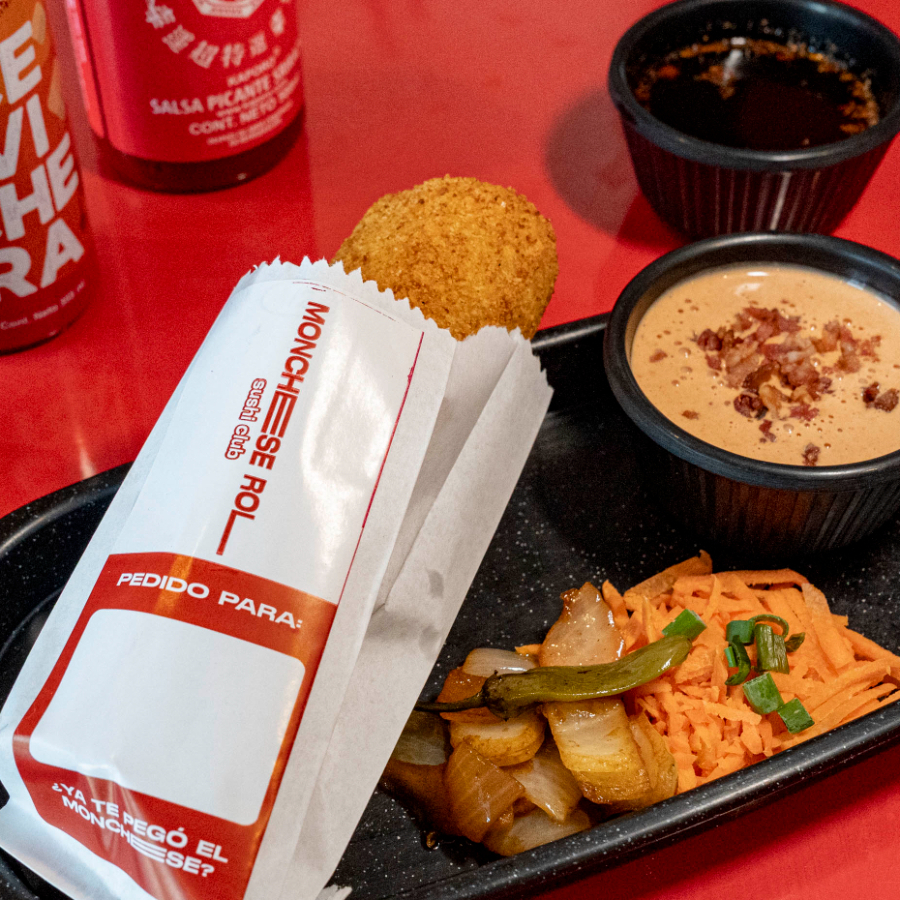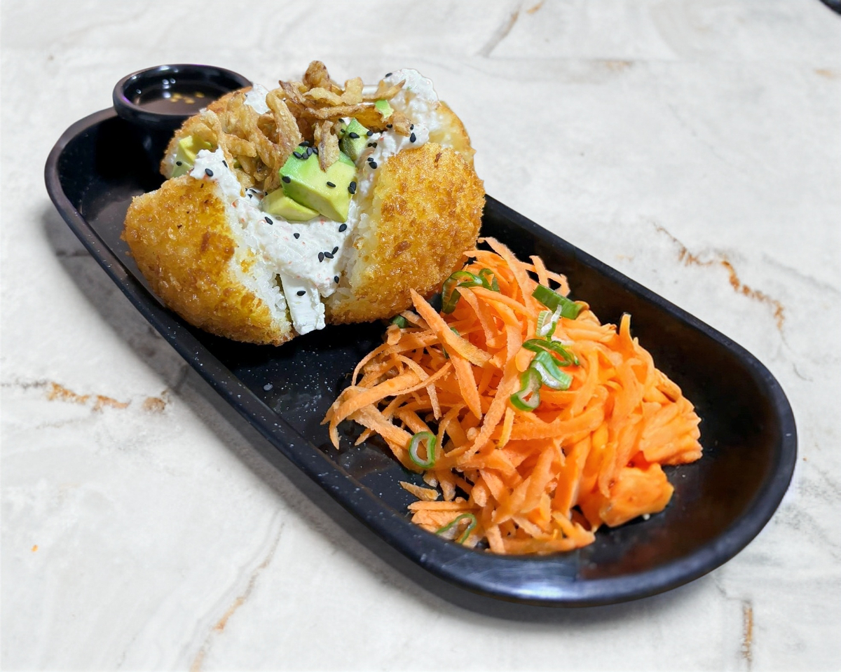 Esfera de arroz rellena de queso crema, aguacate, aderezo, tampico, coronada con cebolla, crujiente y ajonjolí.