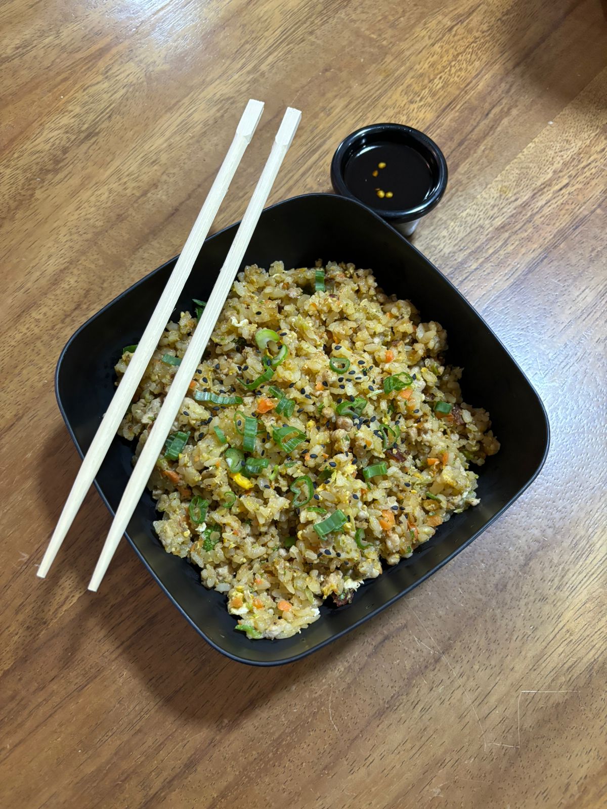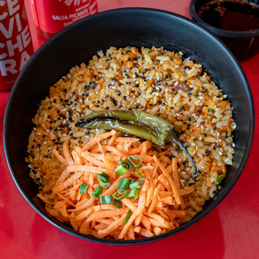 Arroz frito con vegetales (zanahoria, calabaza, ajo, cebolla) coronado de cebollín fresco y ajonjolí.