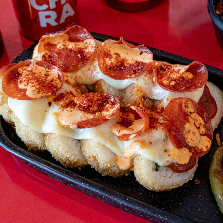 ROLLO RELLENO DE QUESO CREMA, PEPINO, AGUACATE (PROTEINA A ELEGIR) BAÑADO EN SALSA DE TOMATE, QUESO MANCHEGO, PEPERONI, CHIMICHURRI Y CHILE QUEBRADO