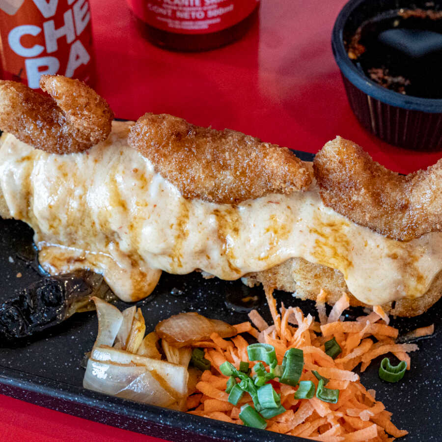 Pollo empanizado, relleno de relleno de queso crema, pepino aguacate, proteína a elegir, bañado en mayonesa picante, queso fundido y coronado con camarones roca.