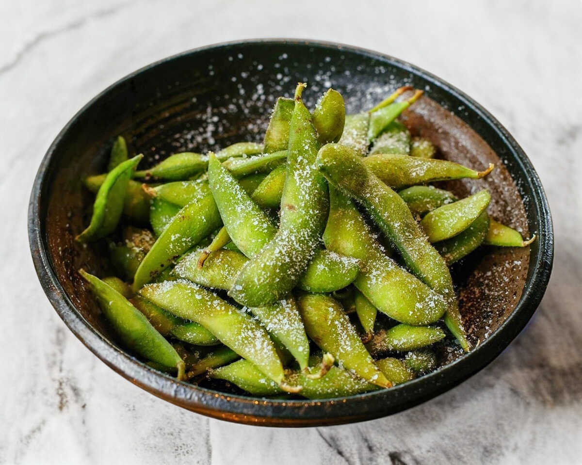 Orden de edamames, acompañadas de salsa soya y ajonjolí.