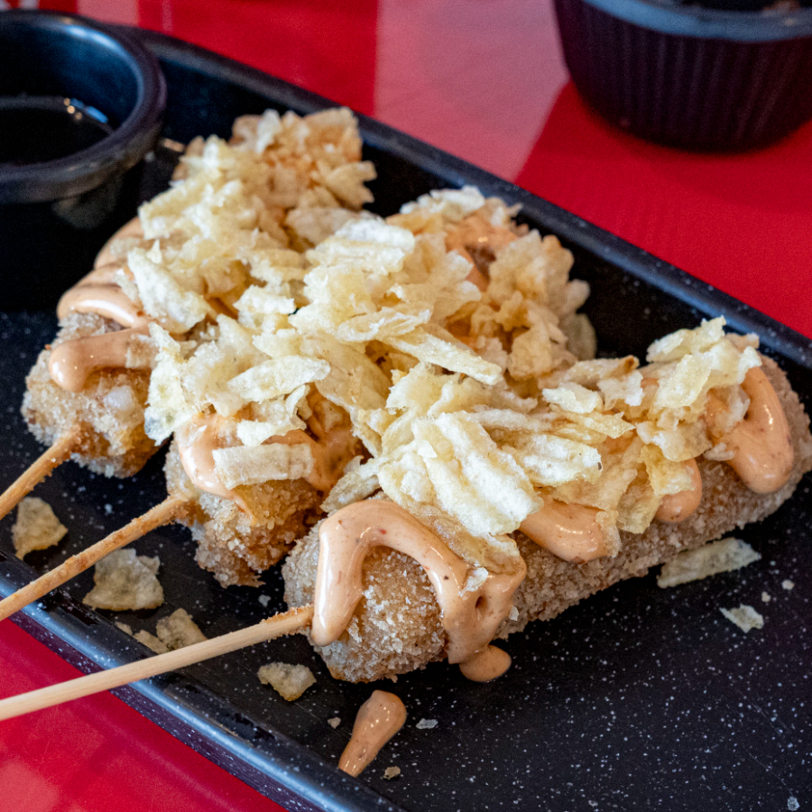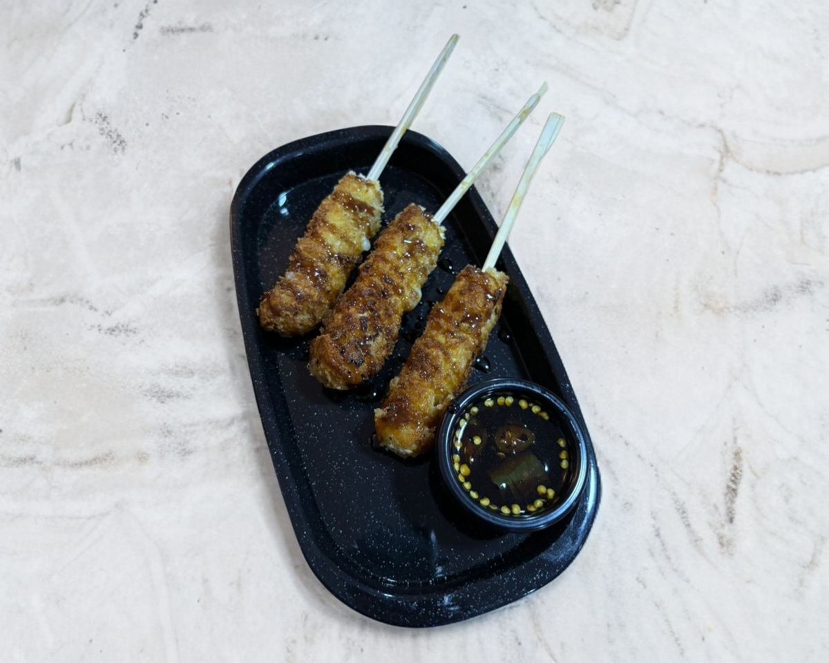 3 pzas De banderillas de queso manchego empanizadas, acompañadas de salsa de anguila.