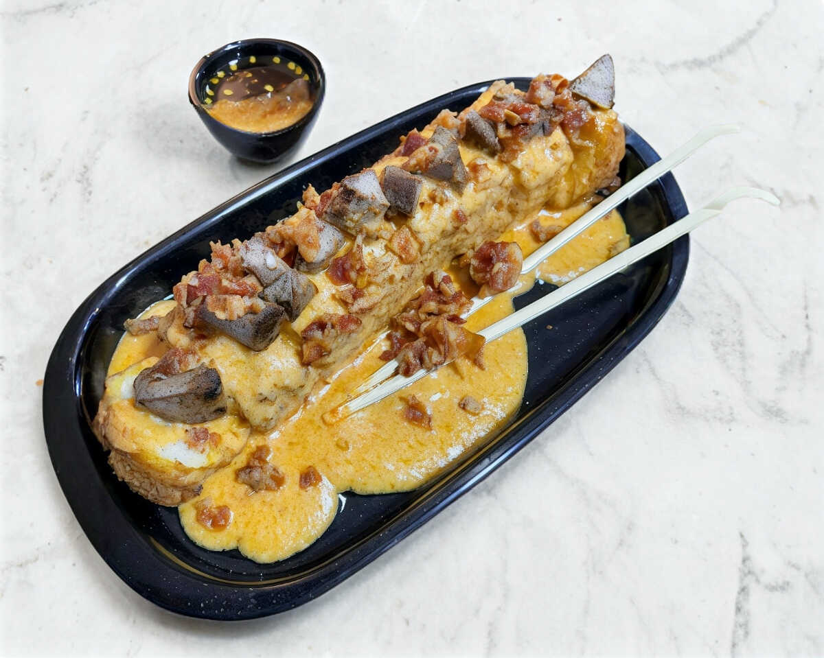 Rollo empanizado relleno de queso, crema, pepino, aguacate, proteína a elegir bañada en mayonesa picante, queso fundido, coronado con arrachera y tocino.