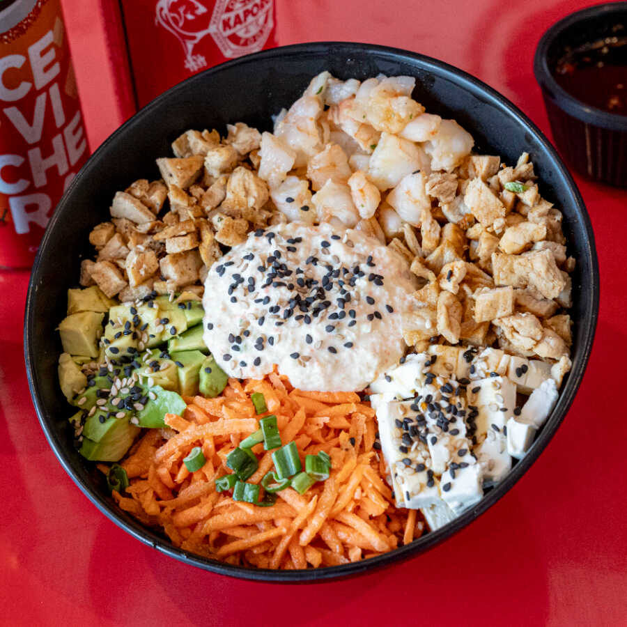 ARROZ FRITO CON VEGETALES, CARNE DE CERDO, CAMARÓN Y POLLO. TOPPINGS : QUESO CREMA, AGUACATE, ADEREZO TAMPICO Y UN TOQUE DE AJONJOLÍ.