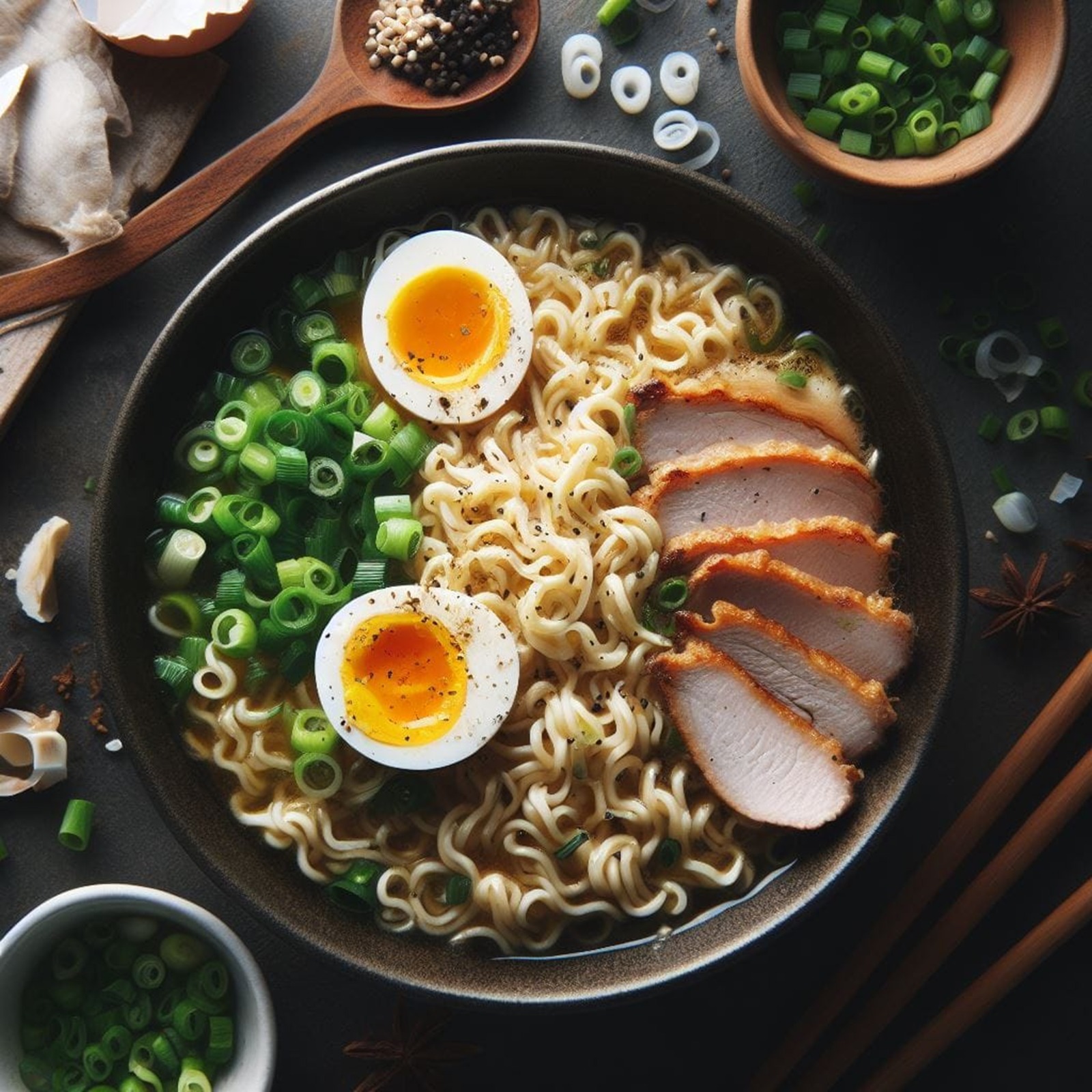 Sopa de fideos acompañado de arrachera, alga, huevo cocido, cebollin, naruto y champiñon