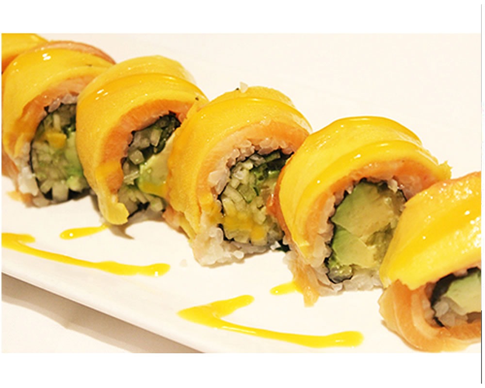 Rollo de arroz relleno de proteina, pepino, aguacate, philadelphia, habanero y decorado con mango en el exterior