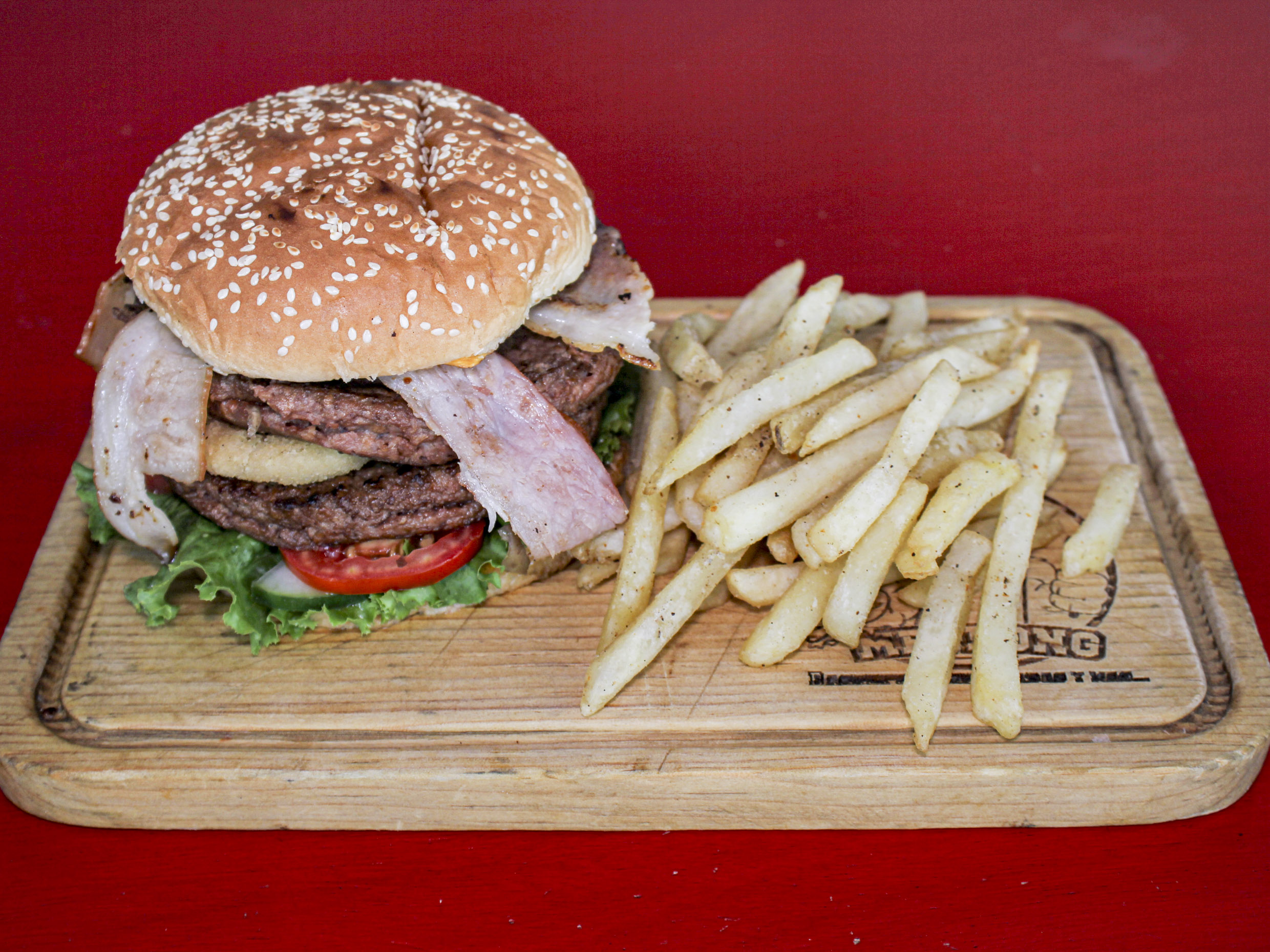 Godzilla (3 quesos, doble carne, tocino, aros de cebolla y vegetales).