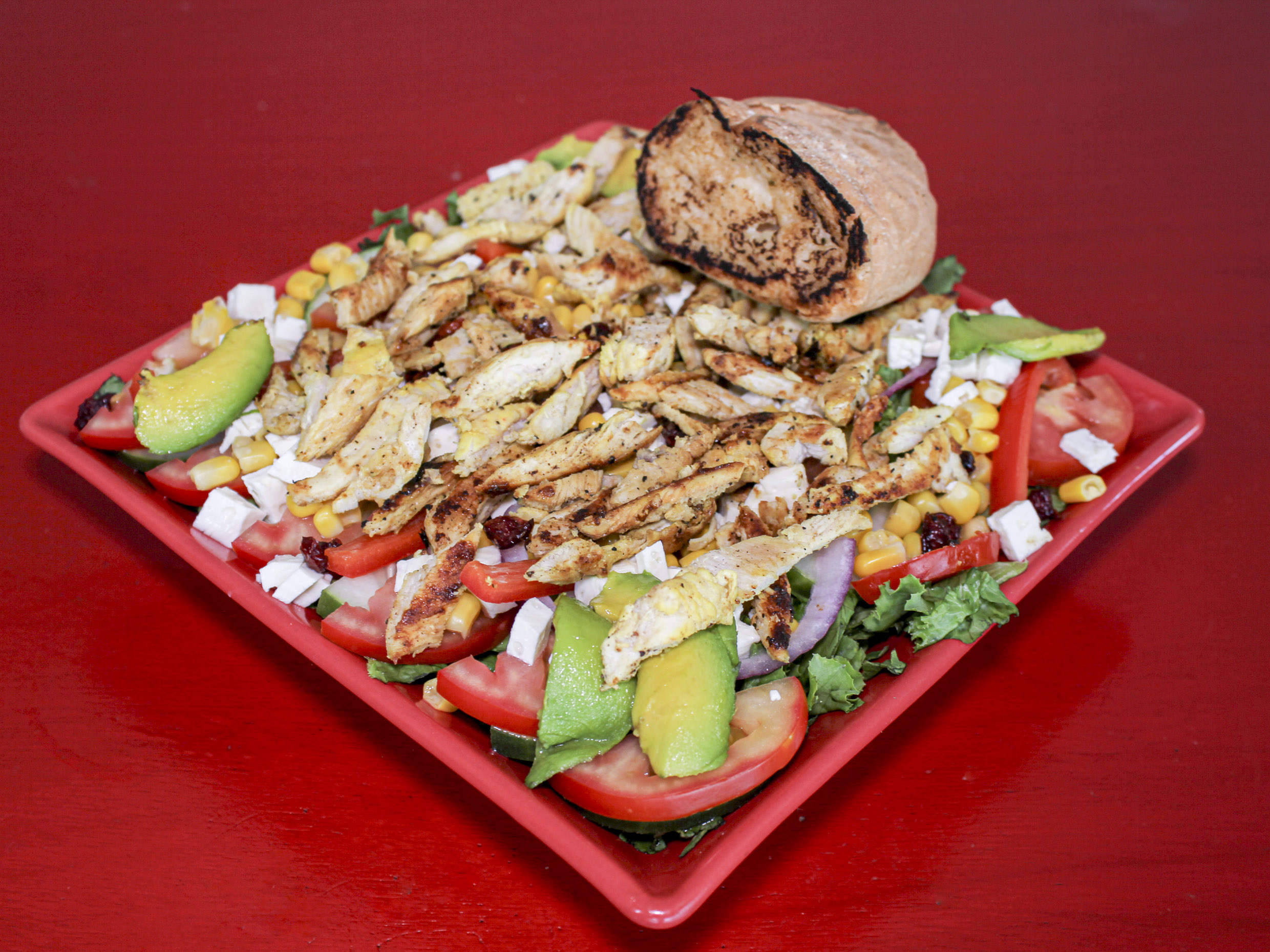 Lechuga, morrón, jitomate, aguacate, cebolla, arándano, pepino, elote & panela.