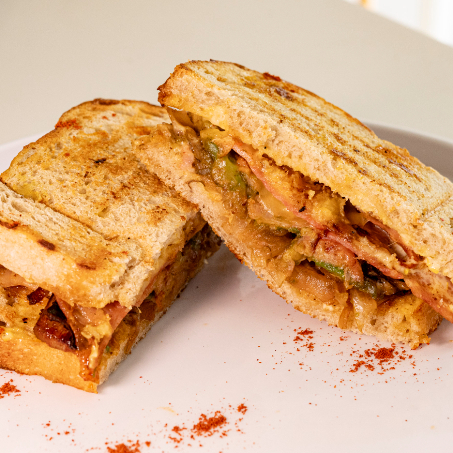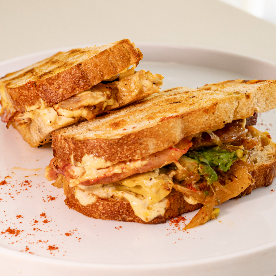 carne de cerdo tipo pulled pork, jamon de pierna, queso gouda, aguacate, aderezo mostaza y habanero tatemado.