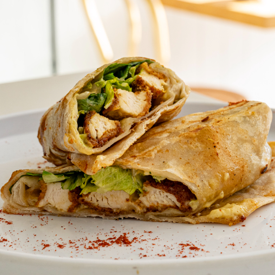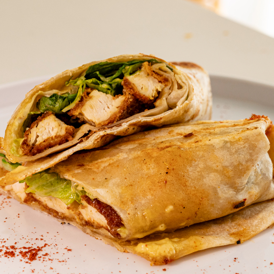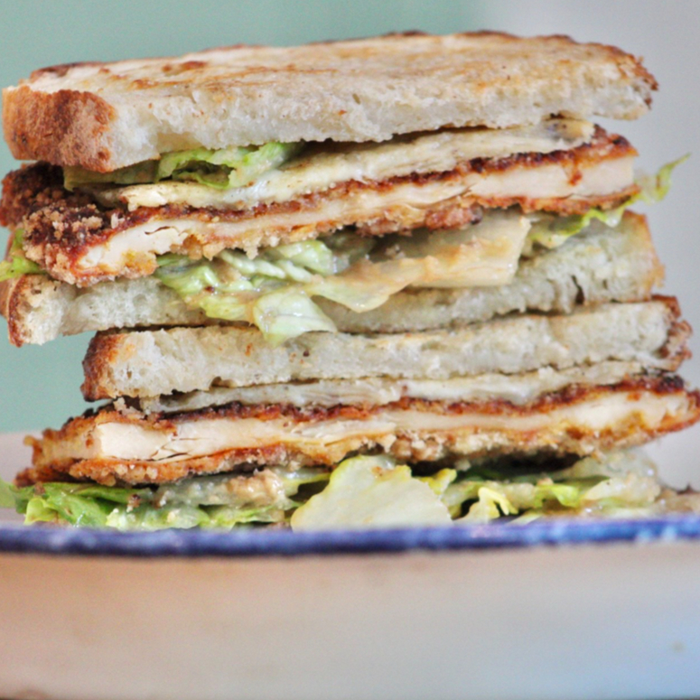 pollo empanizado ,lechuga romana, aderezo cesar y ranch.