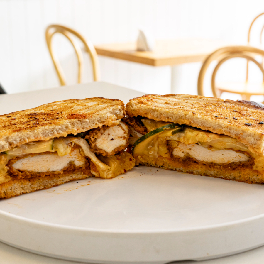 POLLO EMPANIZADO CUBIERTO EN SALSA CASERA ALITAS, PEPINOS ENCURTIDOS, QUESO GOUDA Y ADEREZO SRIRACHA