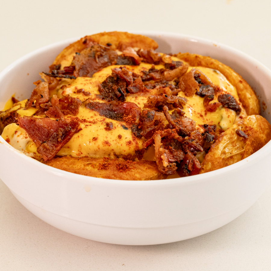 papas gajo, paprikaa, queso cheddar, tocino y aderezo alioli con pepinillos .