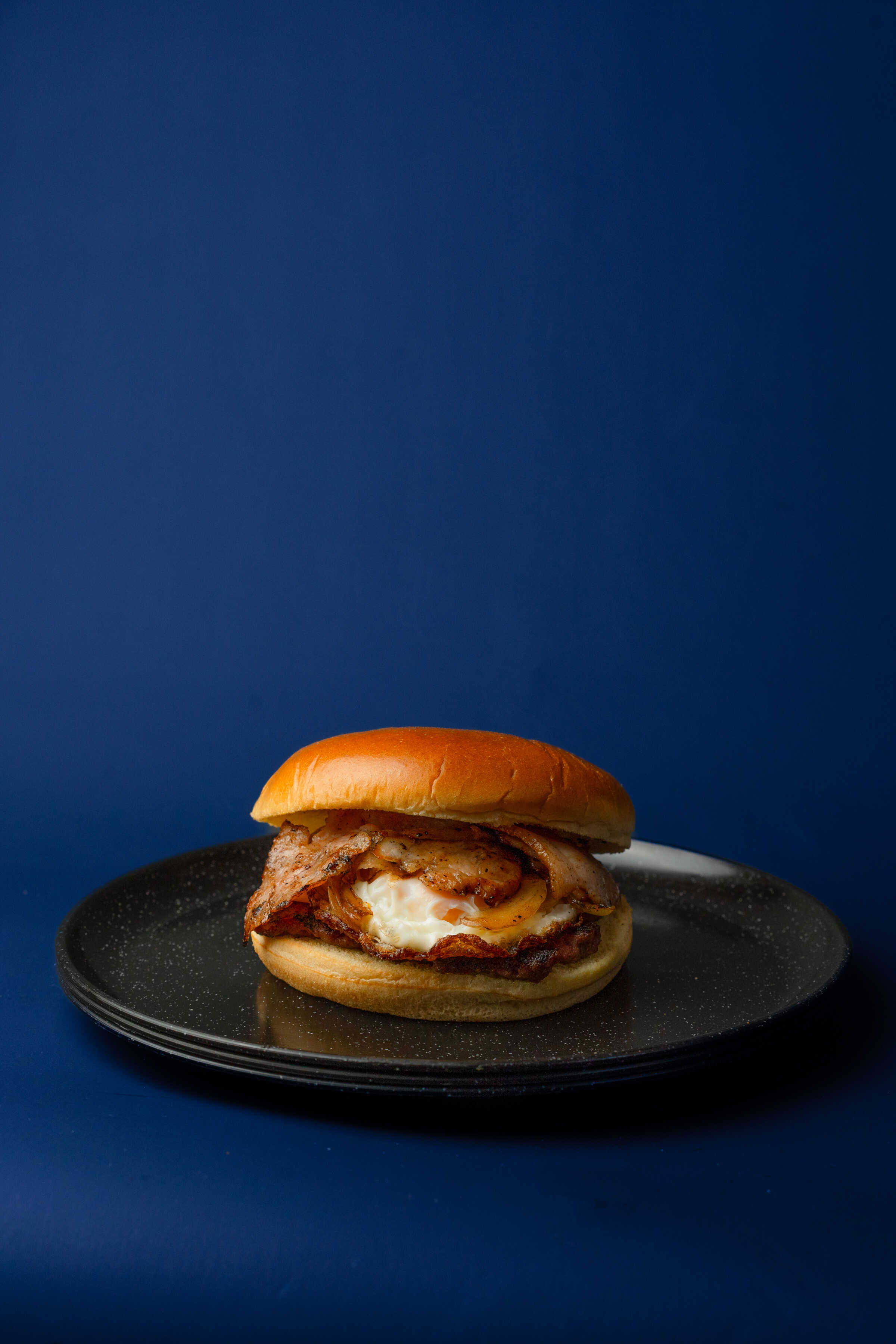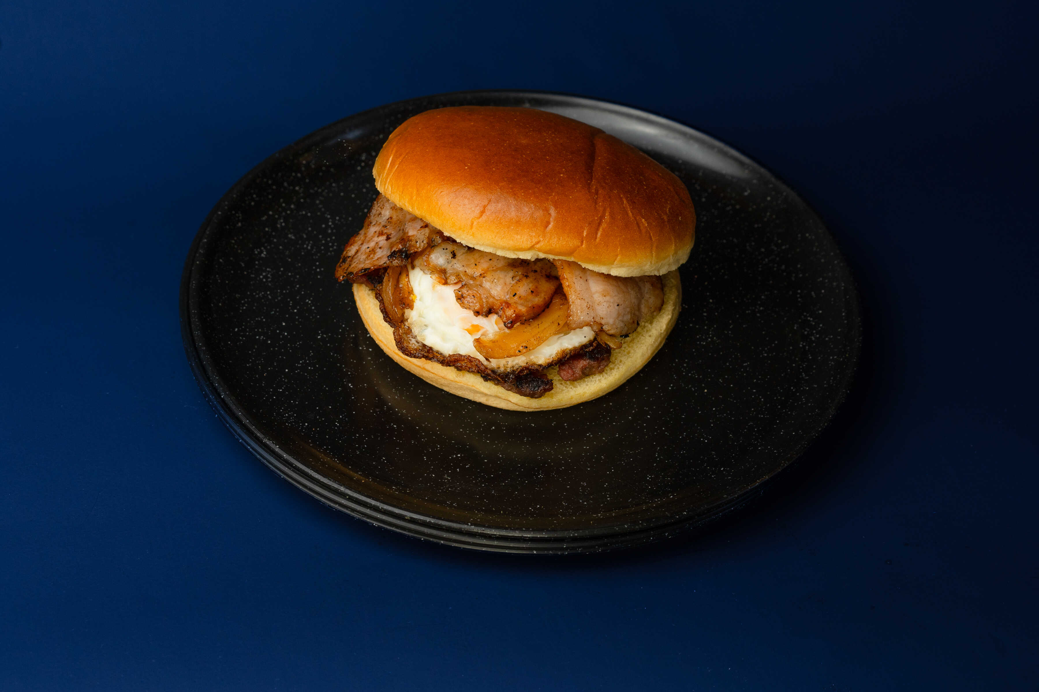 Pan brioche, carne, huevo frito, tocino, queso, cebolla asada y mayonesa de la casa.