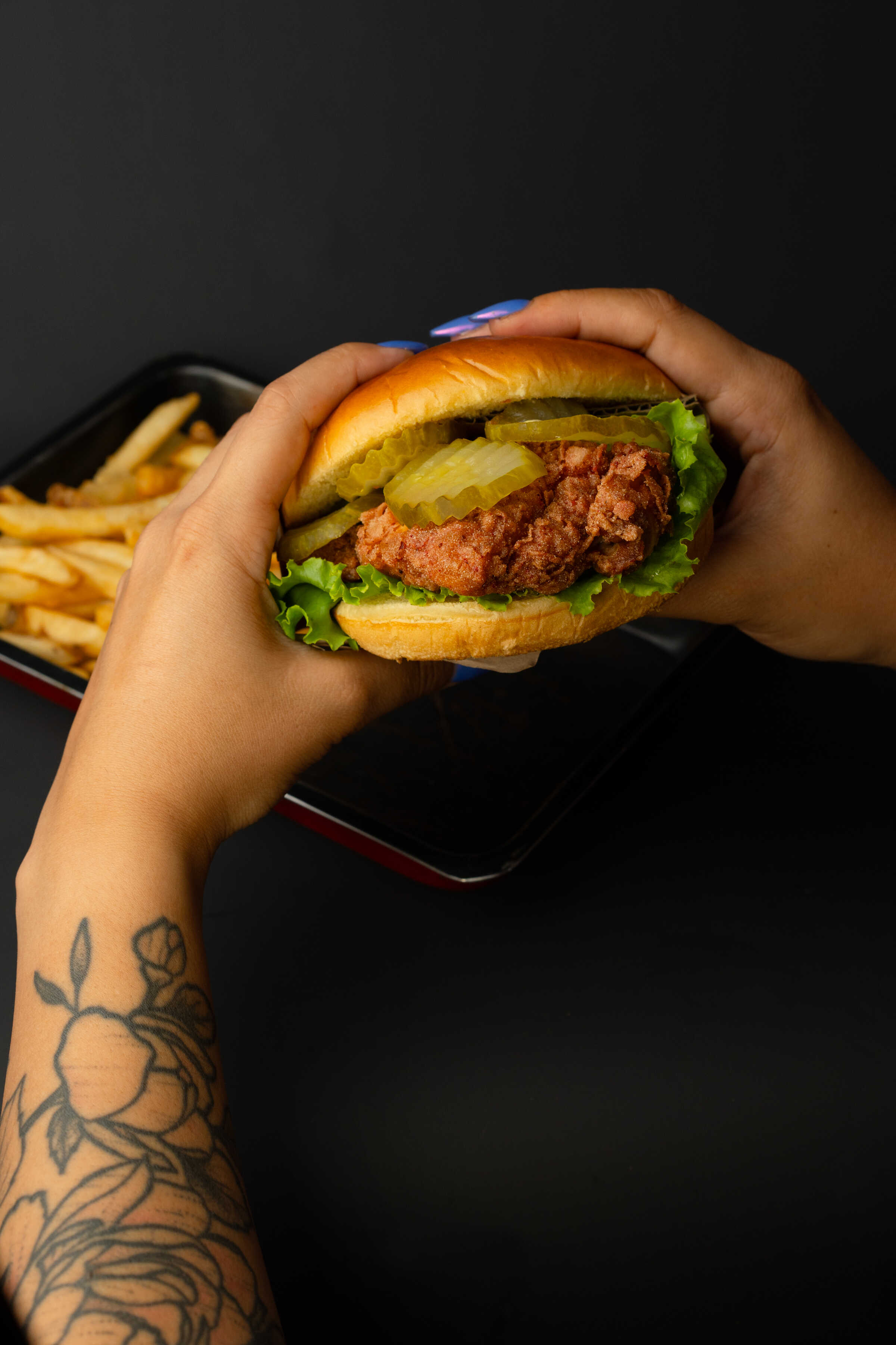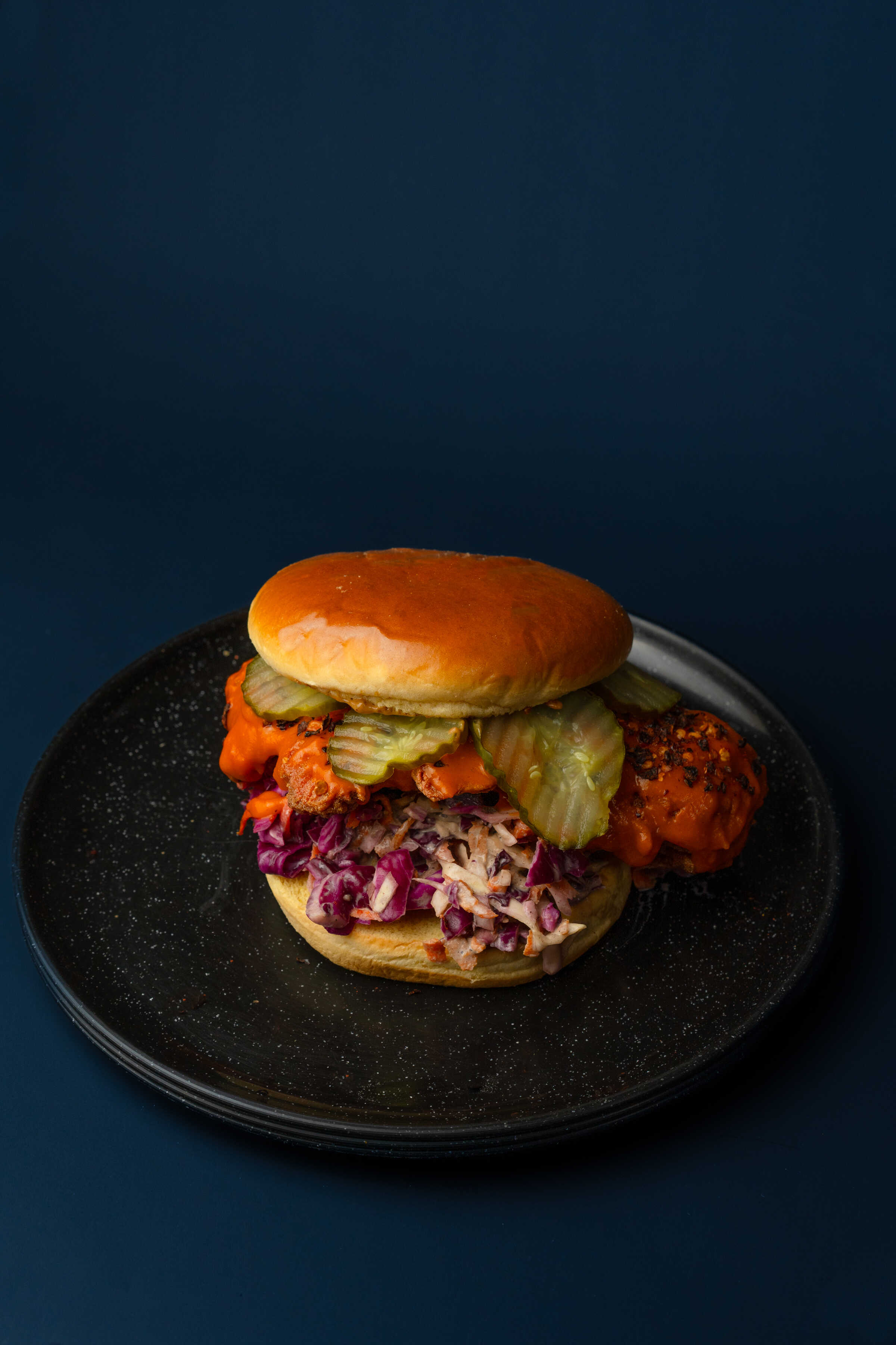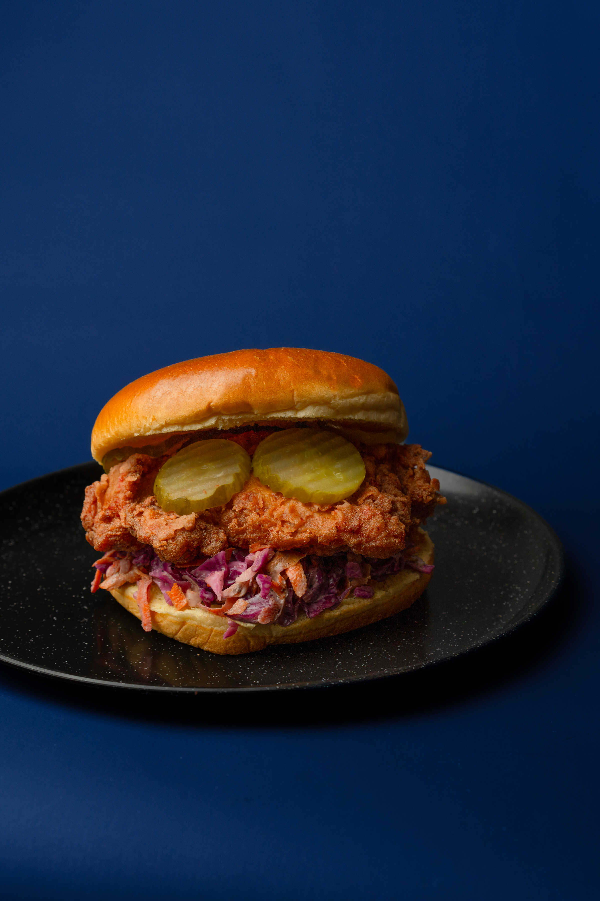 Pan brioche, pollo frito bañado en salsa muy picante, pepinillos, coleslaw y mayonesa de la casa.