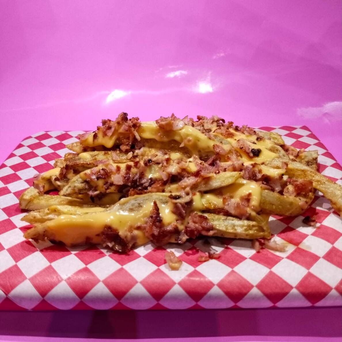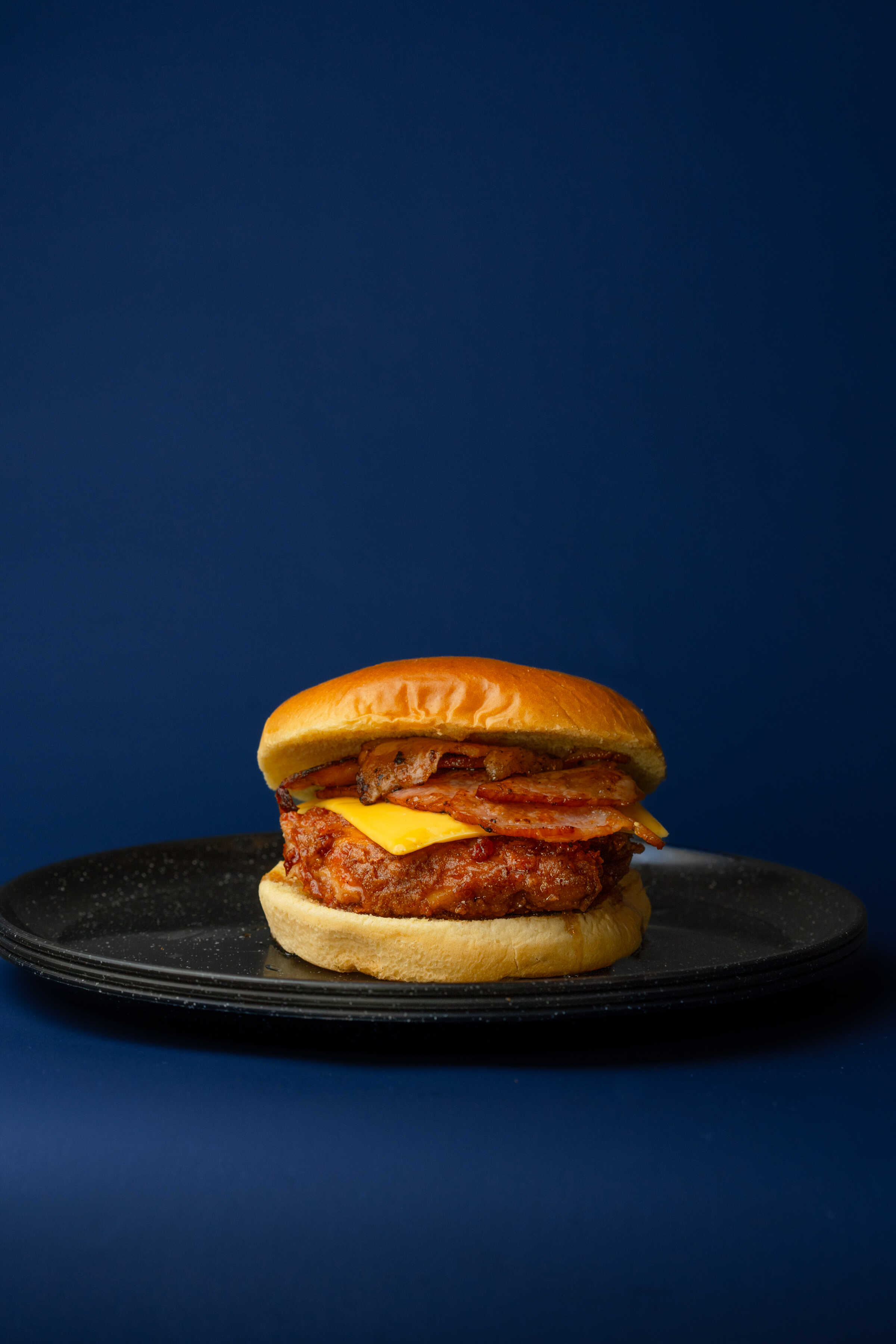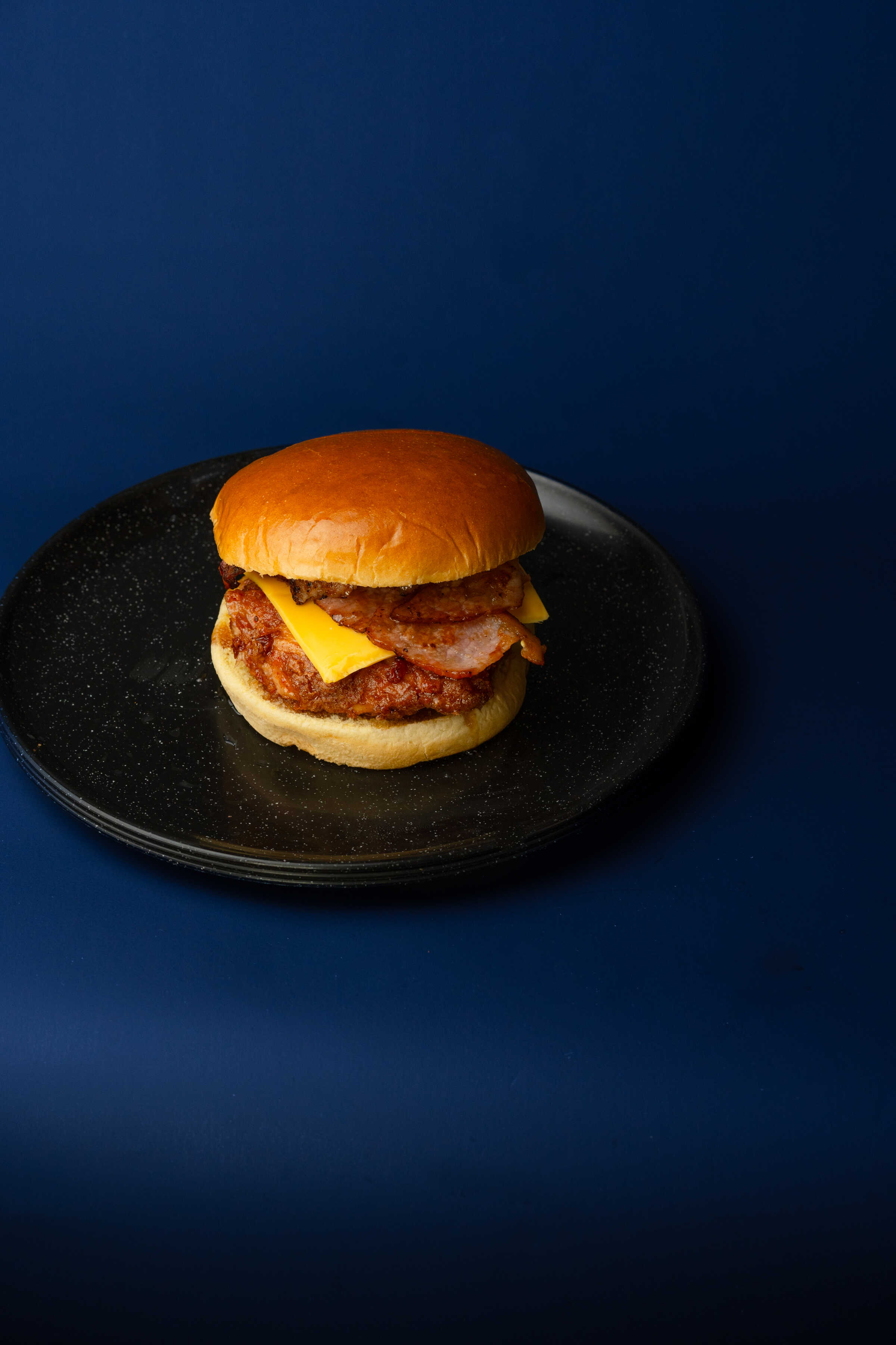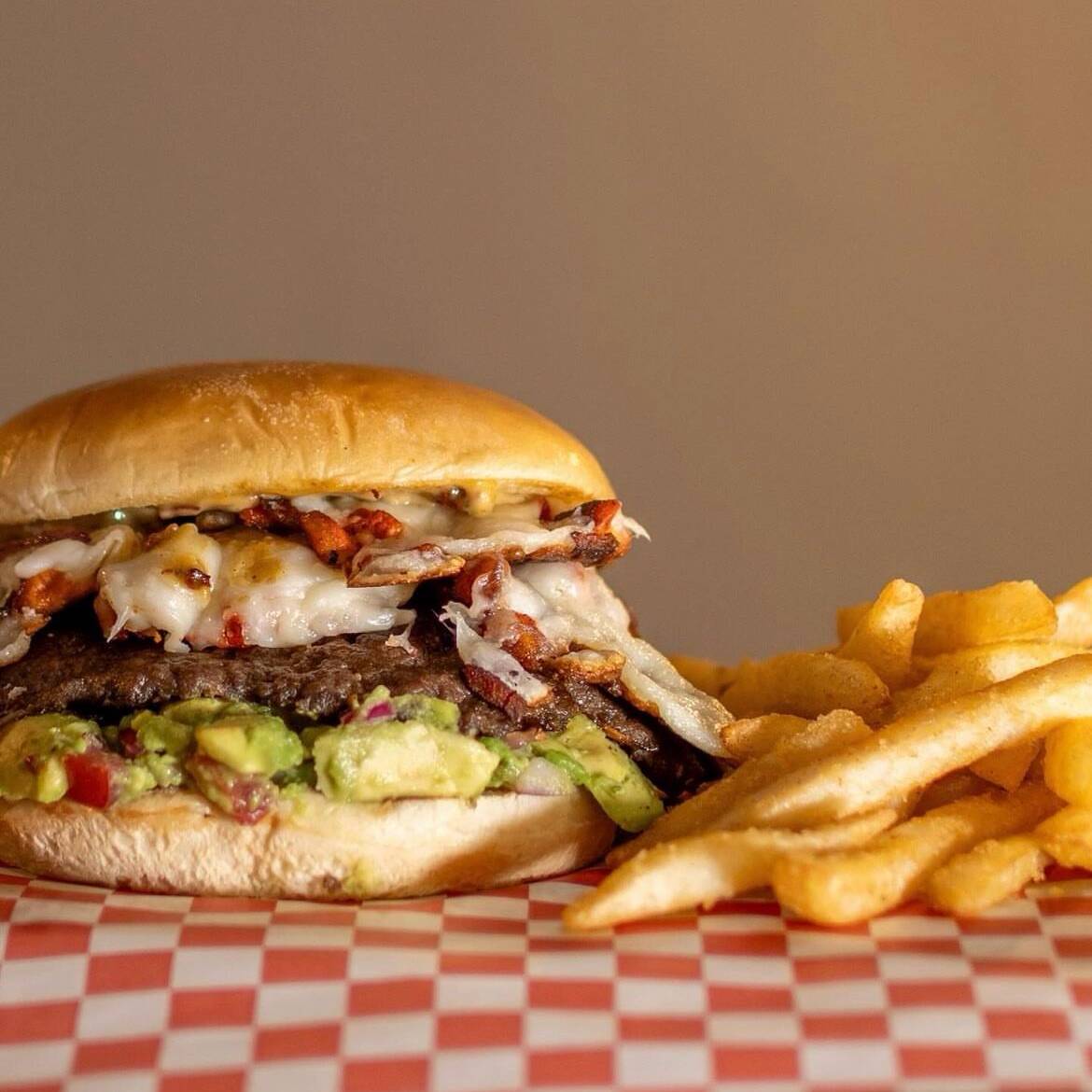 Pan brioche, carne, queso, tocino y mayonesa de la casa.