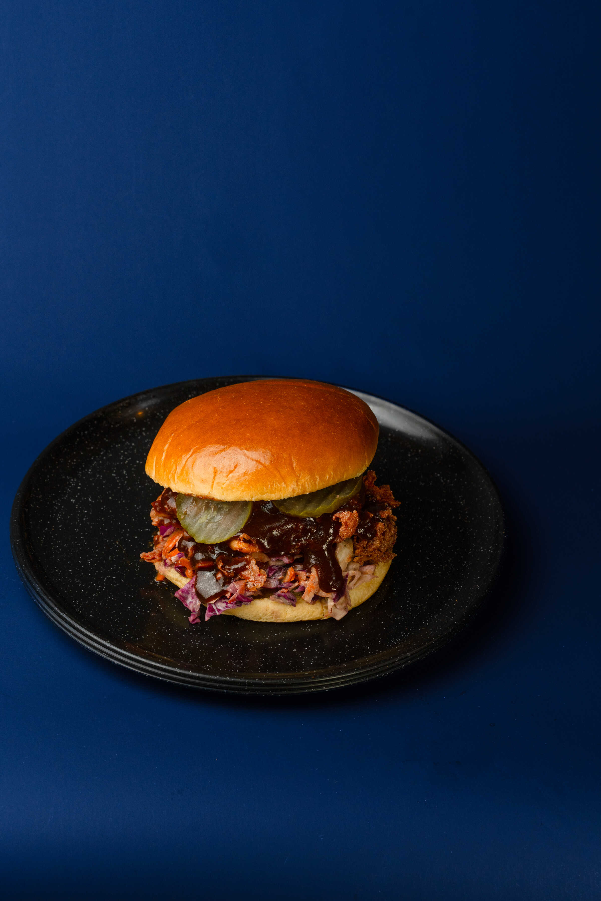 Pan brioche, pollo frito con salsa BBQ, coleslaw, pepinillos y mayonesa de la casa.