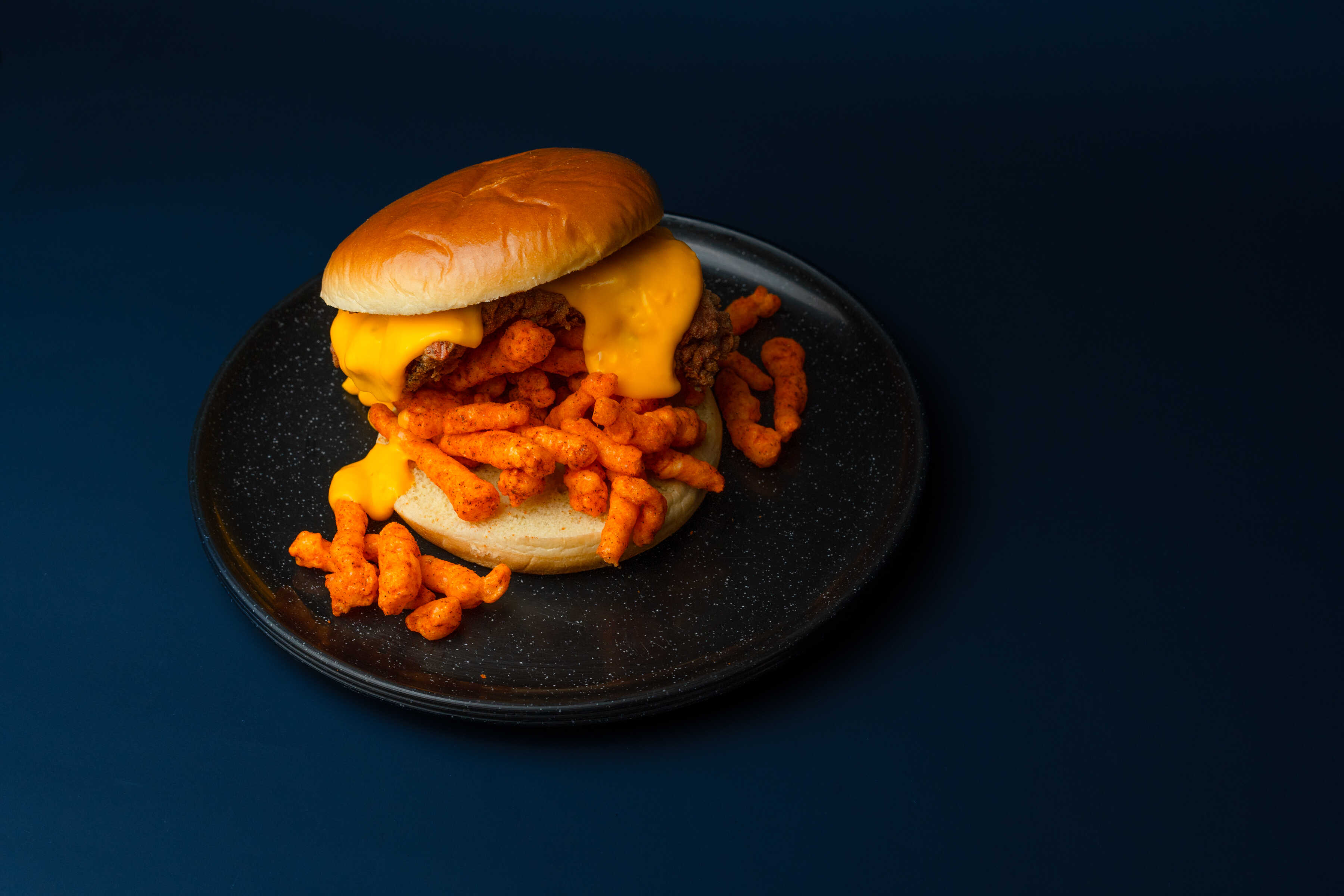 Pan brioche, pollo frito, cheetos, queso cheddar y mayonesa de la casa.