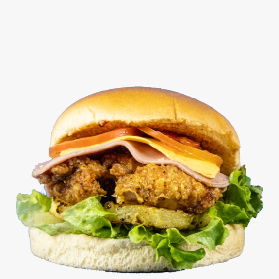 Pan brioche, pollo frito bañado en miel maple con mantequilla, queso americano, tocino y mayonesa de la casa.
