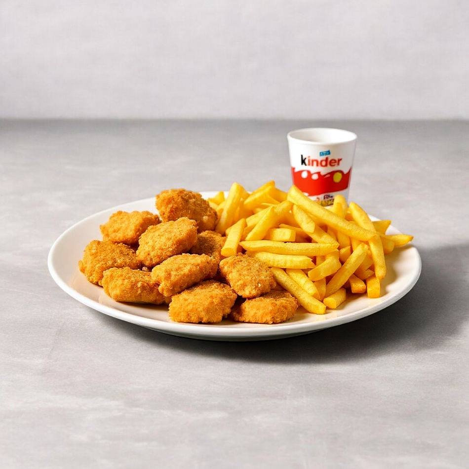 Nuggets 150 g, papas 80 g, juguito y Kinder Delice.