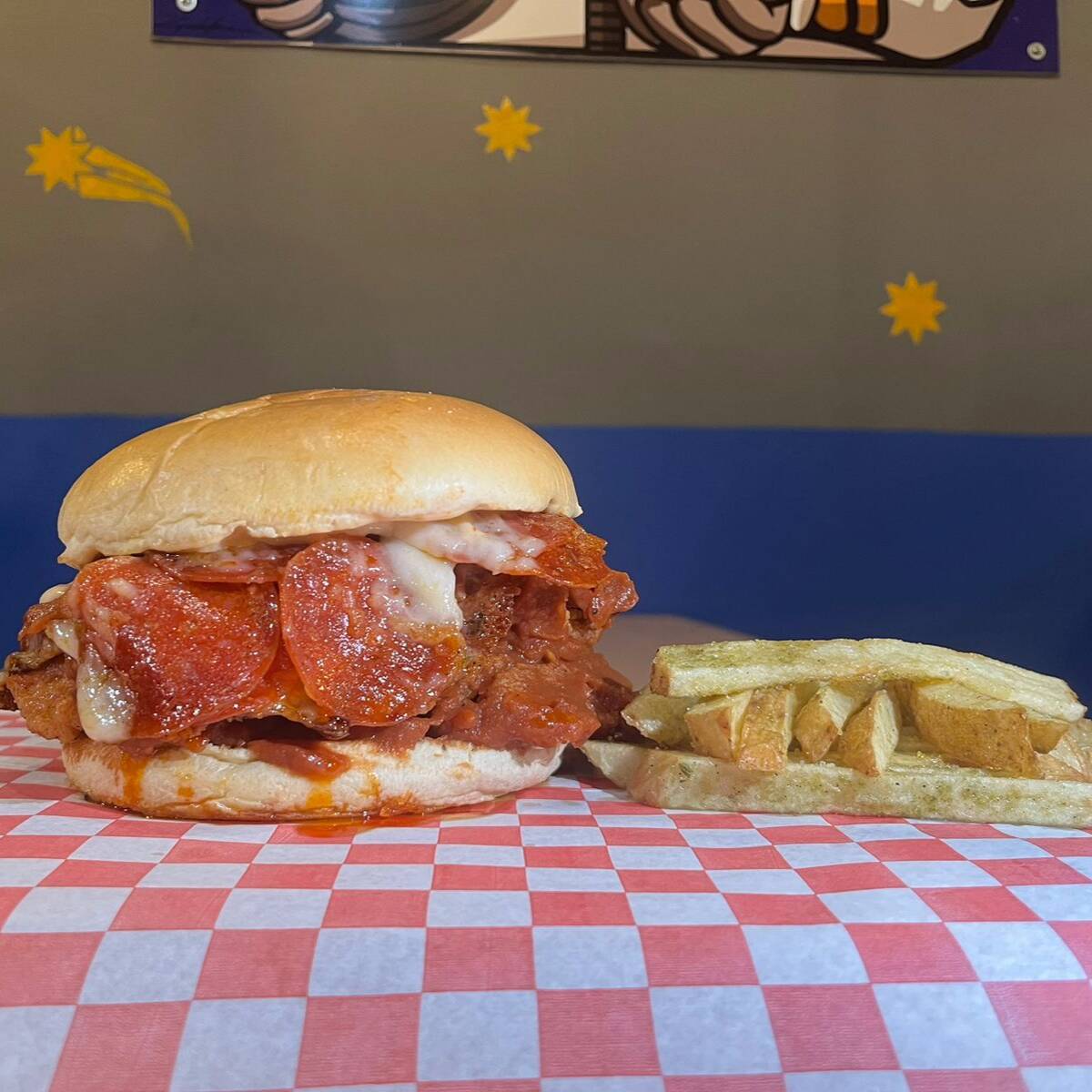 Pan brioche, pollo frito, salsa de tomate, queso asadero, pepperonI, mayonesa de la casa