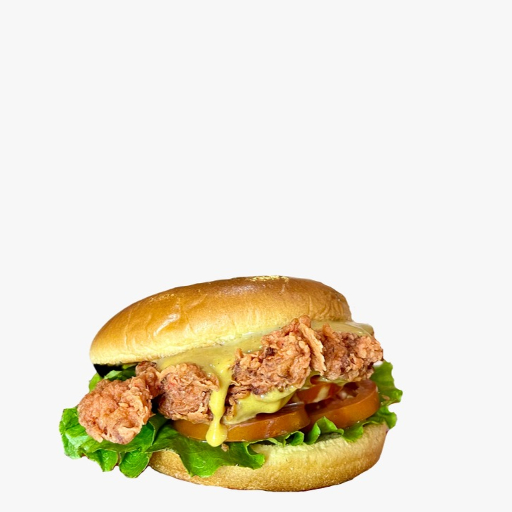 Pan brioche, pollo frito, lechuga, jitomate y la salsa secreta de nuestra estación espacial.