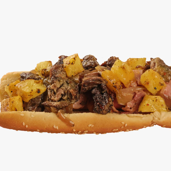 Pan brioche, carne de res, cebolla asada, pastor de @chelaychuchita, piña y un toque de salsa de naranja chipotle.