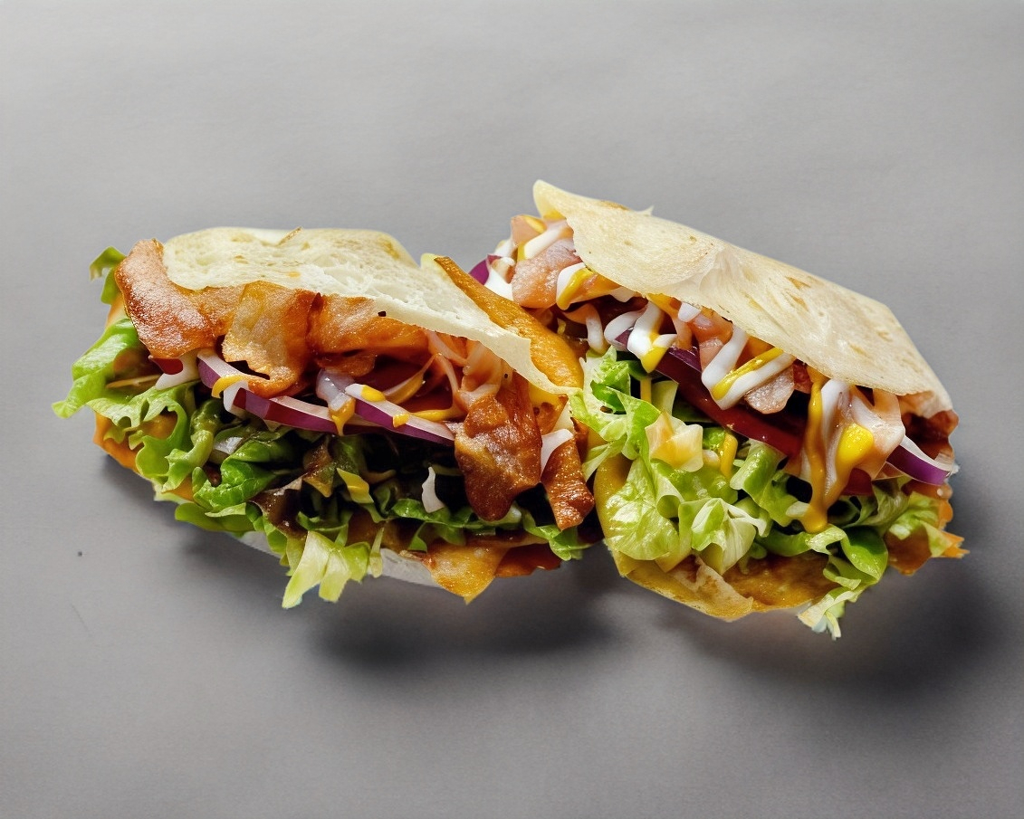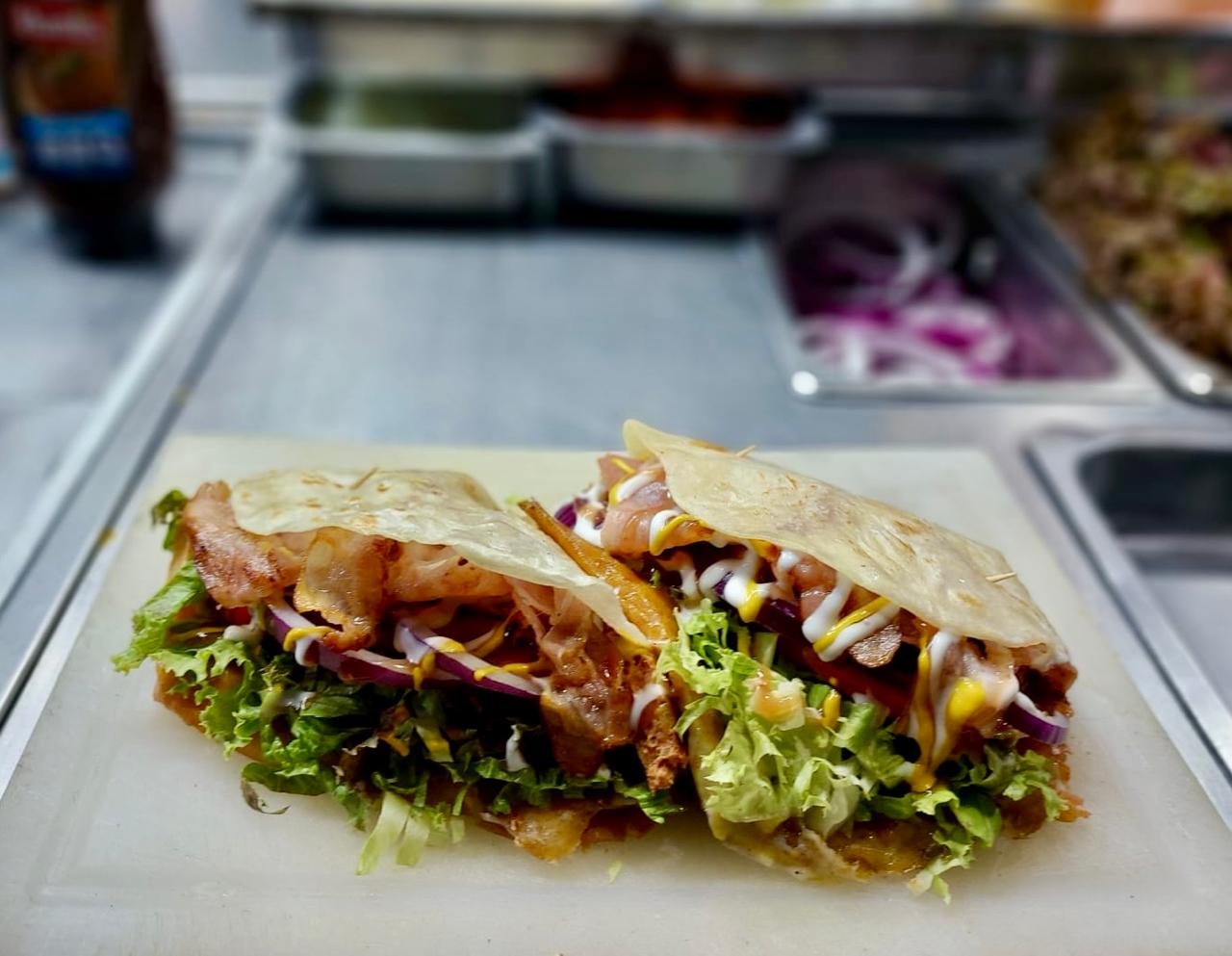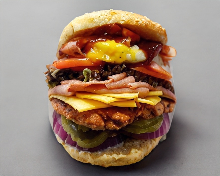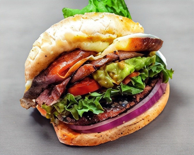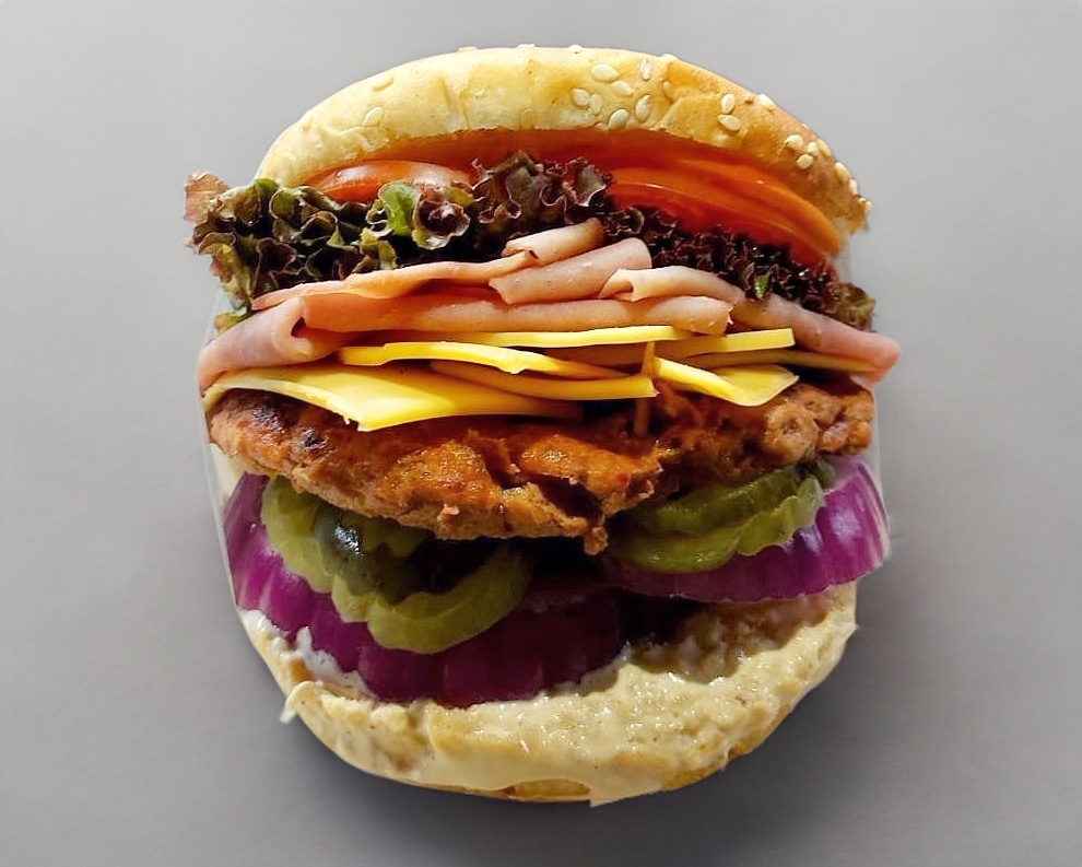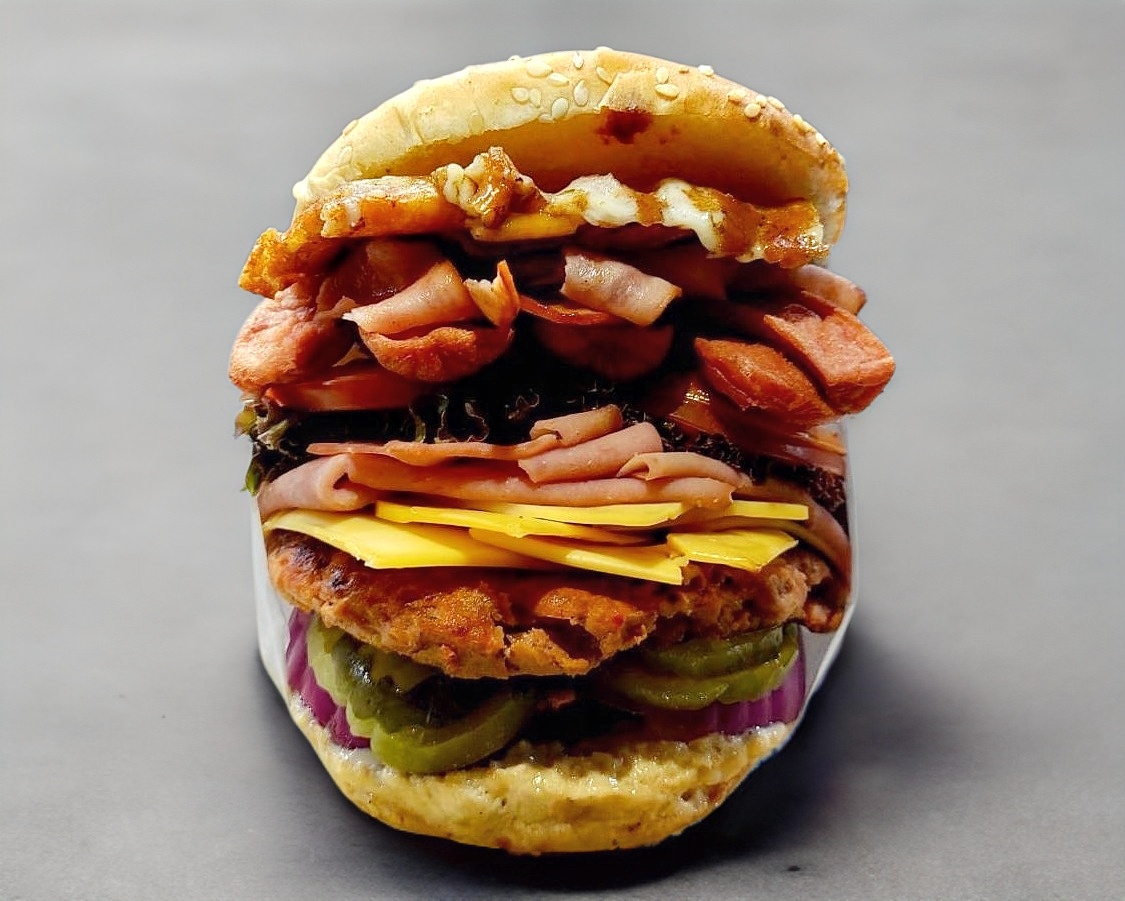 Carne de res, jamón, queso americano, queso gratinado, salchicha de pavo, tocino, lechuga, jitomate, cebolla morada, pepinillos y aderezo de la casa.