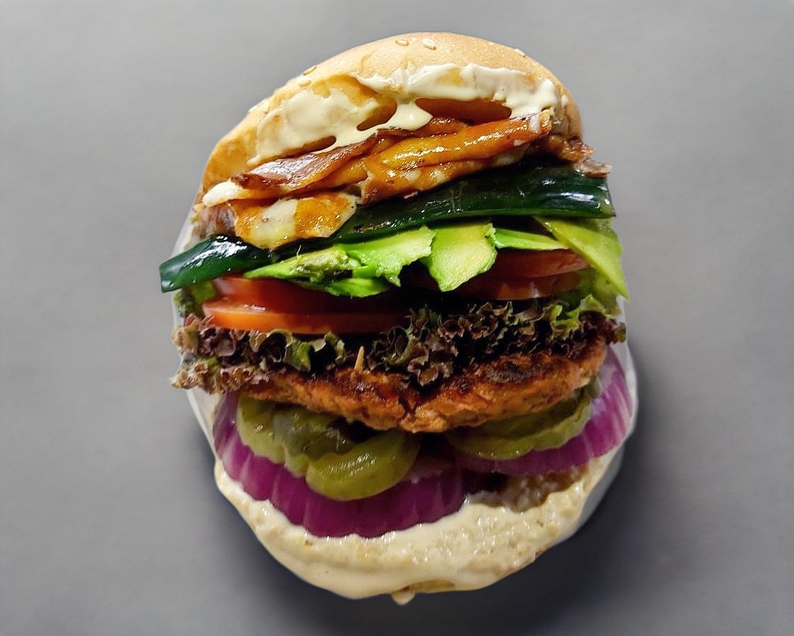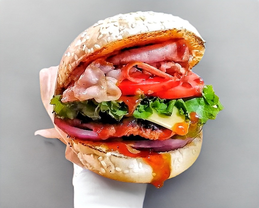 Carne de res, queso gratinado, tocino, guacamole, jitomate, lechuga, pepinillos, cebolla morada y aderezo de la casa.