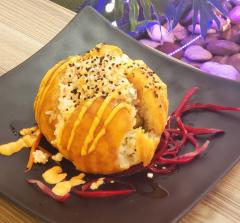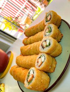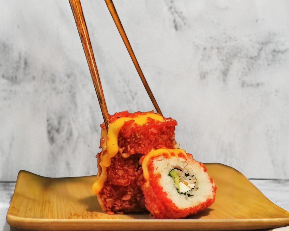 Por fuera empanizado con Takis y Dorito, tampico y chipotle por dentro queso crema, pepino y proteína a elegir.