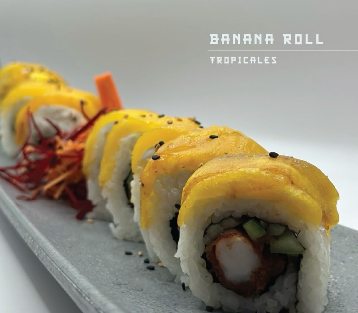 Plátano por fuera, con salsa de anguila por dentro, filadelfia con pepino y carne a elegir.