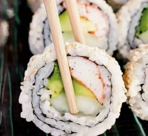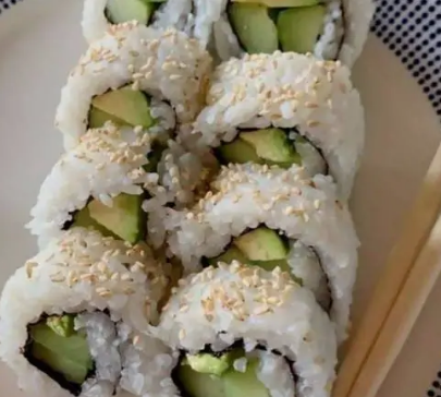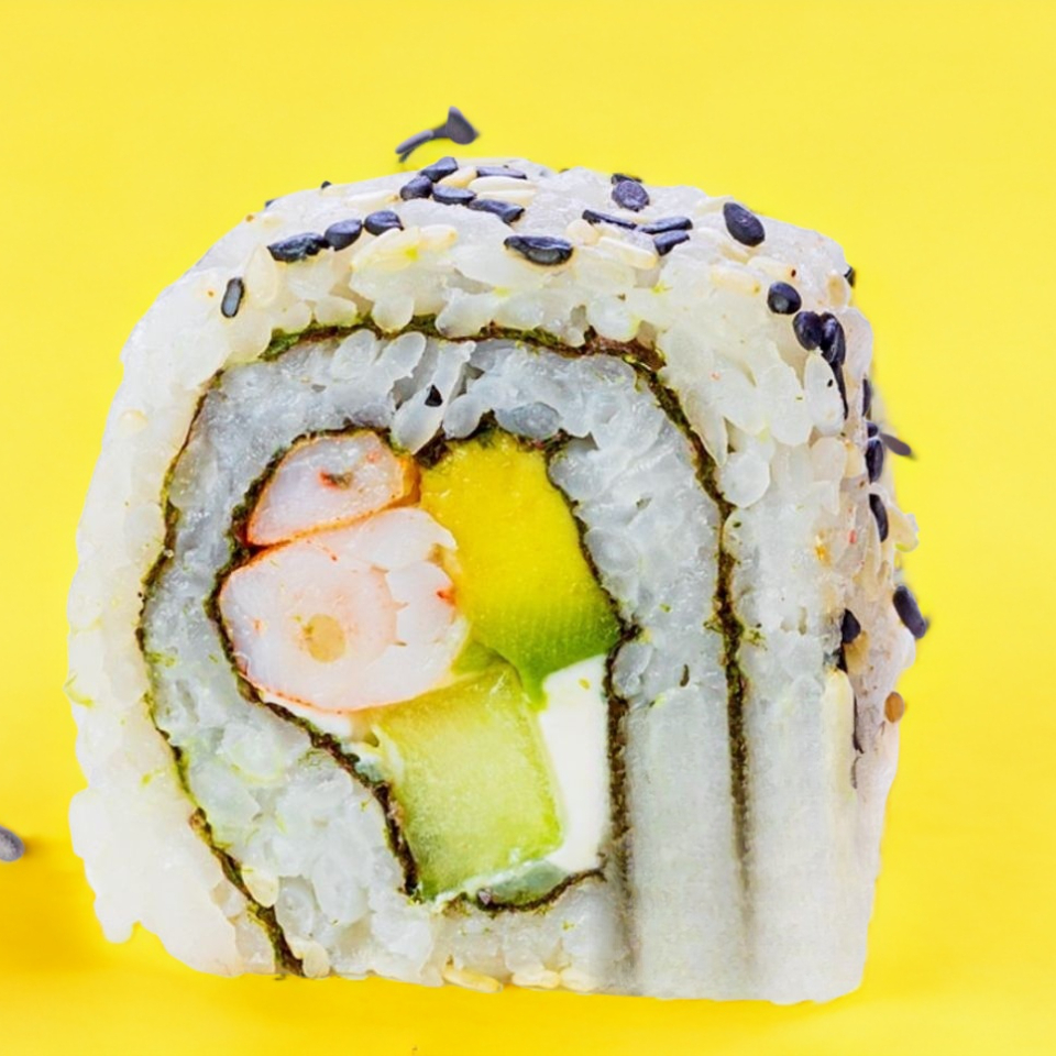 Queso philadelphia, alga, pepino, aguacate, proteína a elegir y base de arroz y ajonjolí.