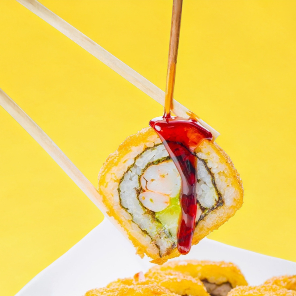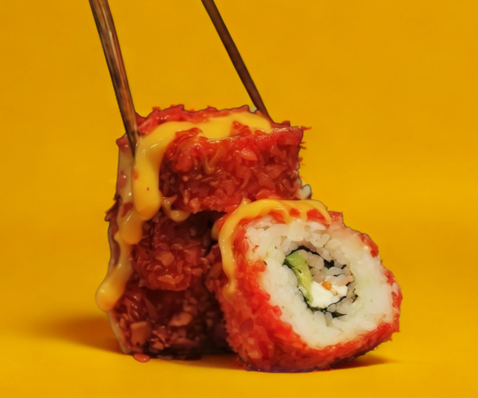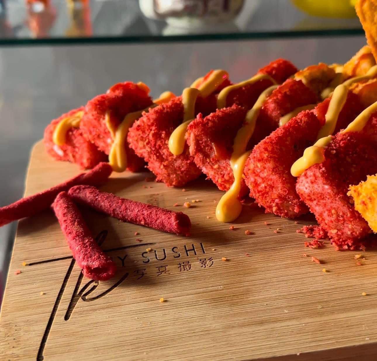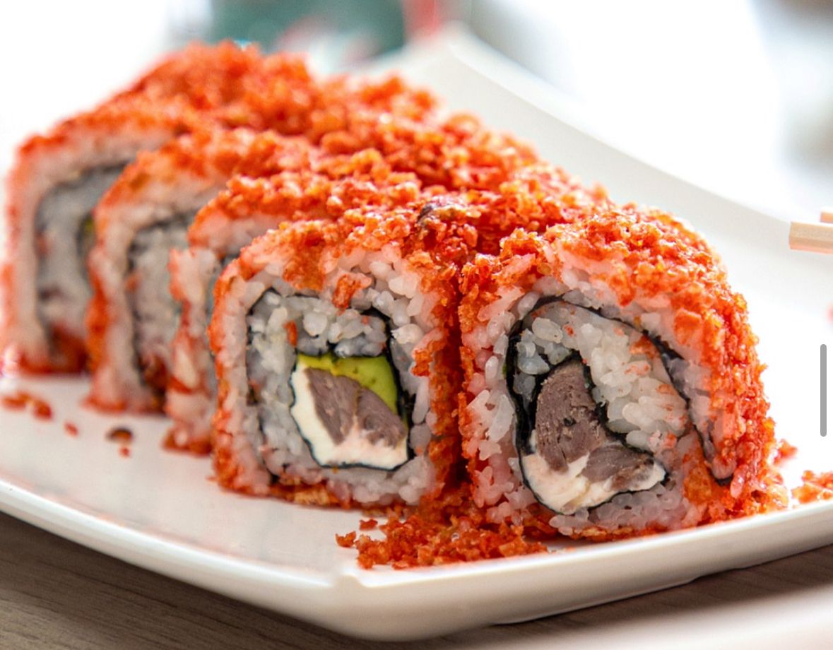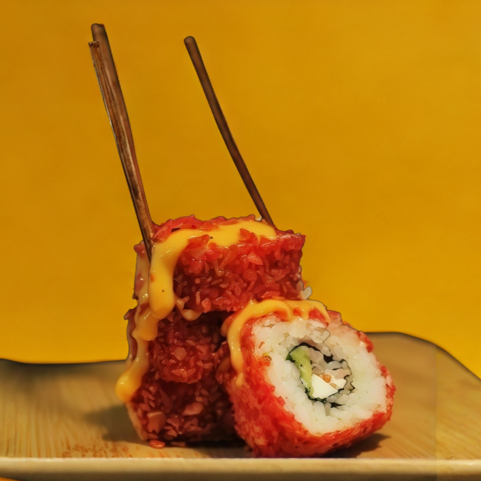 Por fuera empanizado con Takis y Dorito, tampico y chipotle por dentro queso crema, pepino y proteína a elegir.