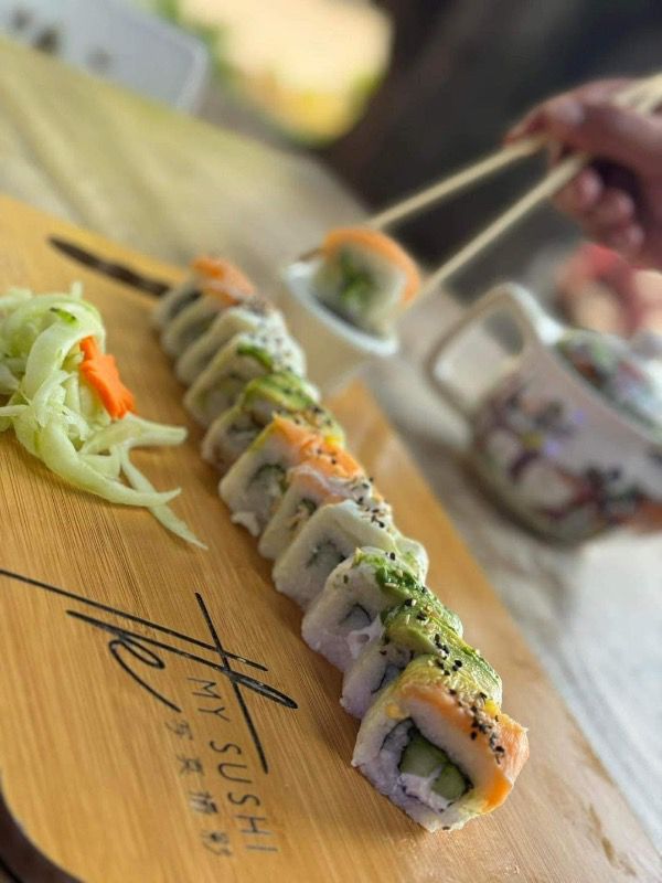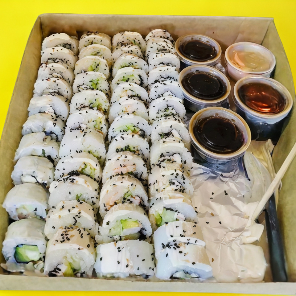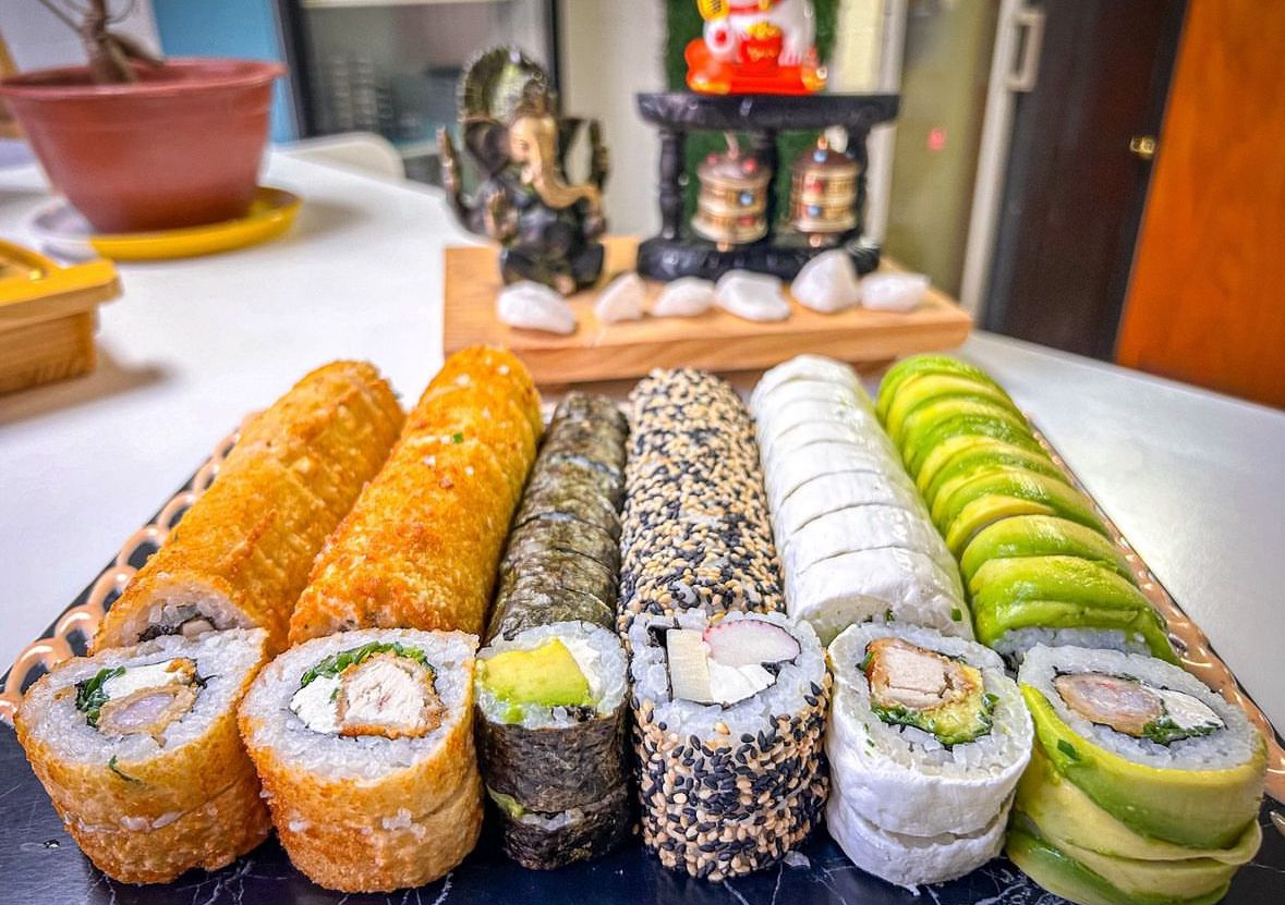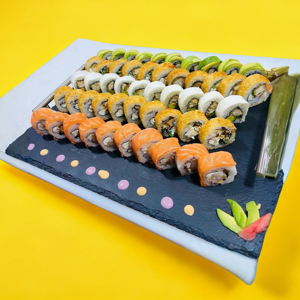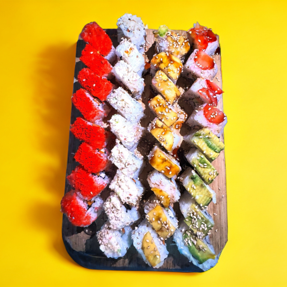 4 rollos diferentes de sushi, incluyendo uno frutal. Acompañados con salsa de soya.