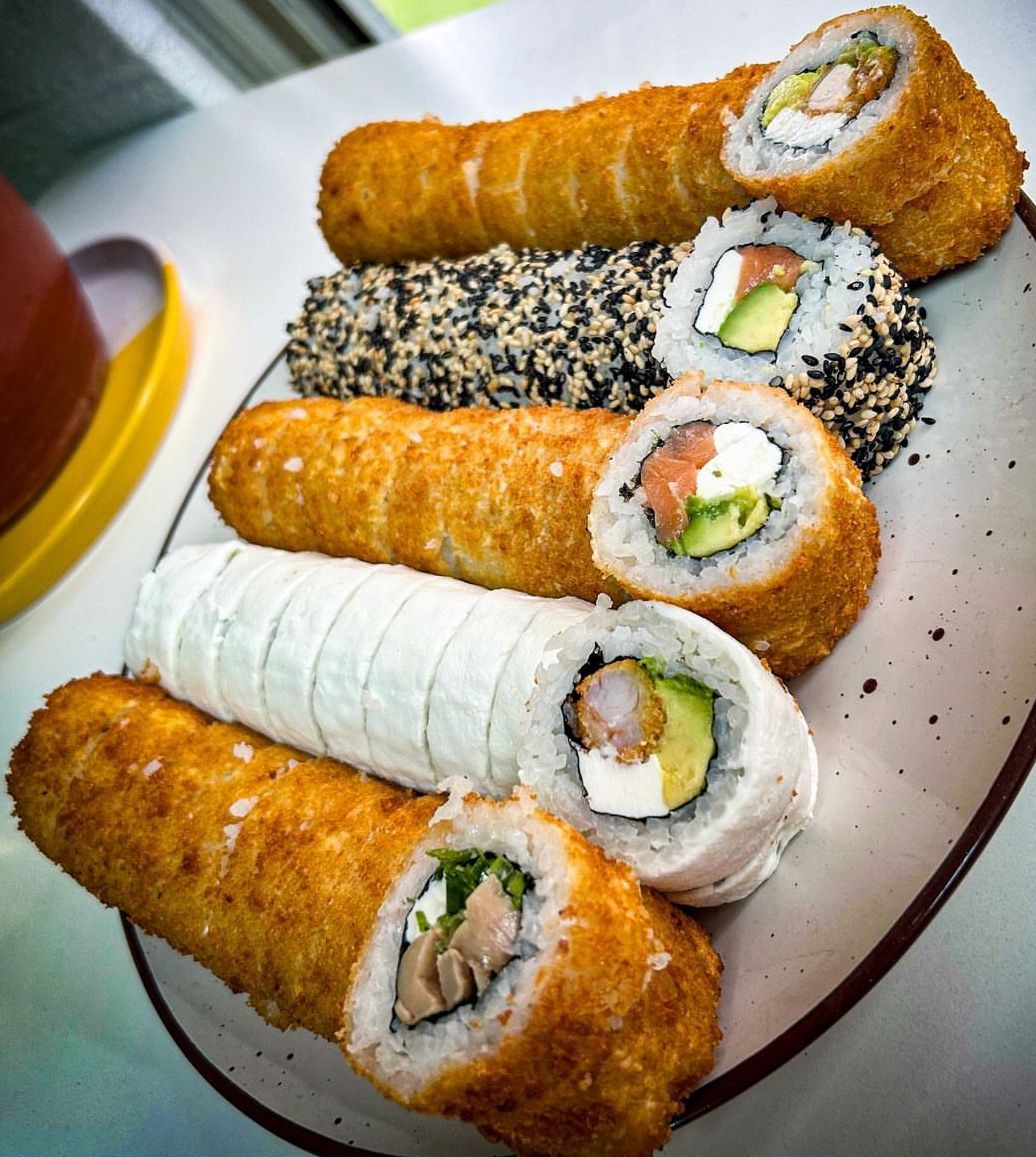 Plátano por fuera, con salsa de anguila por dentro, filadelfia con pepino y carne a elegir.