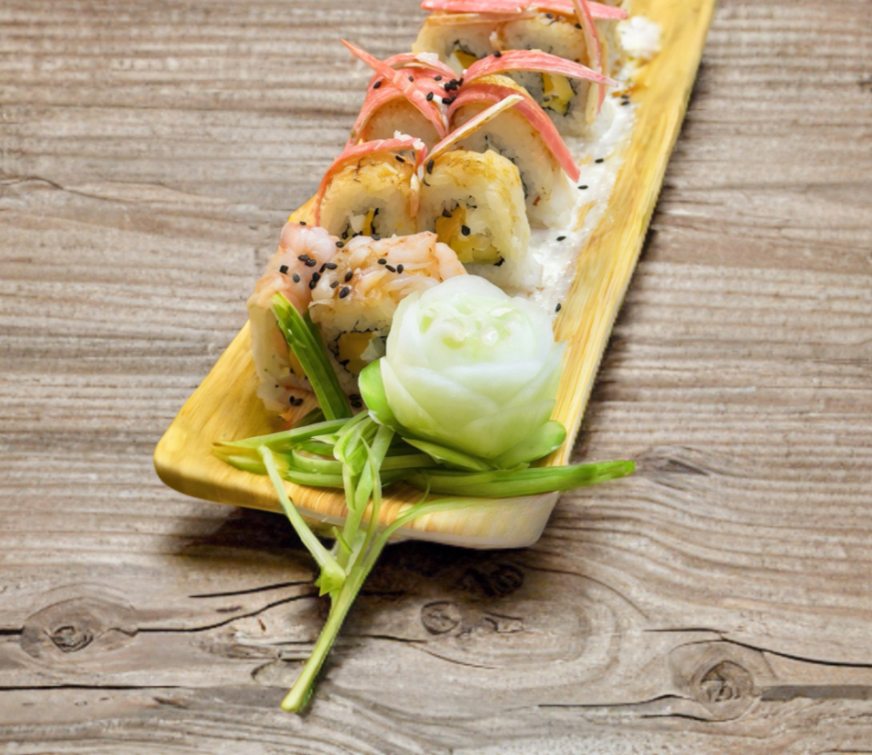 Por dentro camarón mango y queso crema por fuera camarón y surimi