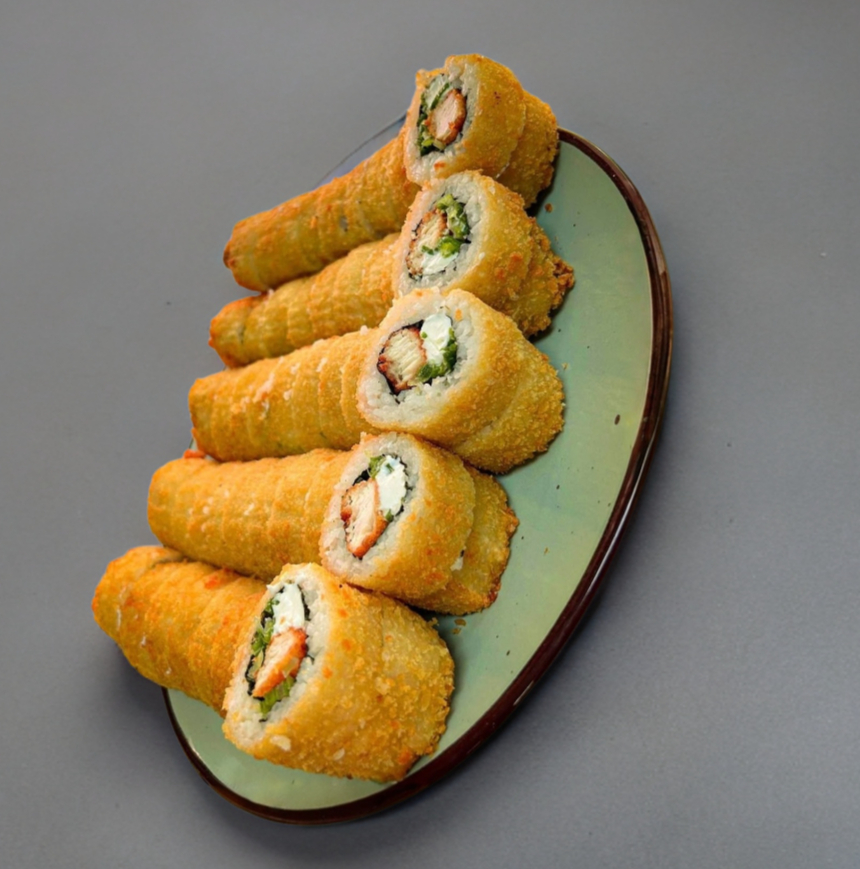 Por fuera empanizado con Takis y Dorito, tampico y chipotle por dentro queso crema, pepino y proteína a elegir.