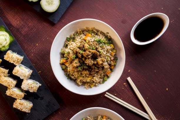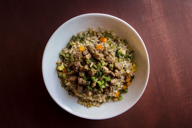 Arroz frito de verduras y huevo con arrachera.