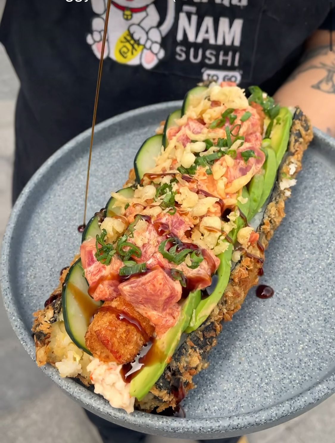 Hotdog de sushi empanizado relleno de surimi y Tampico, con pepino, aguacate, atún spicy y chispas crujientes encima, bañado de salsa de anguila (viene sin cortes se come bocado a bocado como hotdog).