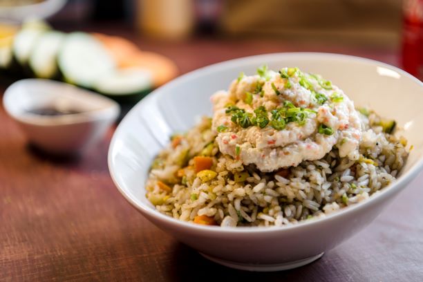 Arroz frito con verduras y huevo, acompañado de pollo, arrachera, queso gouda gratinado, mayo chipotle y cebollin.
