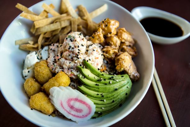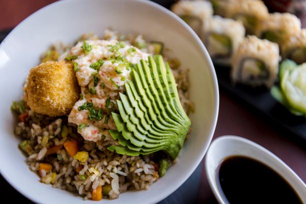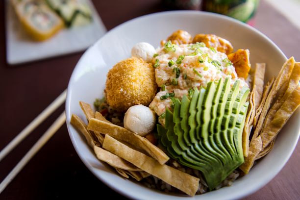 Base de yakimeshi de verduras, acompañado de camarones roca, crispy wonton, aguacate, mini kushiages, tampico y queso crema.