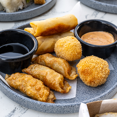 2 piezas de kushiagues de queso, 3 piezas de spring rolls y 3 piezas de gyosas de cerdo, acompañados de salsa pantai y salsa kushiague.