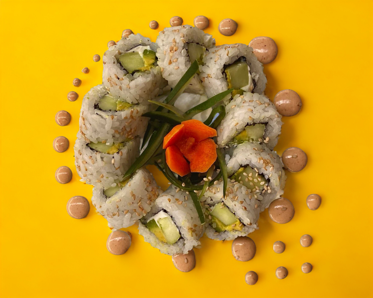 Rollo envuelto de ajonjoli, relleno de pepino, queso crema y aguacate