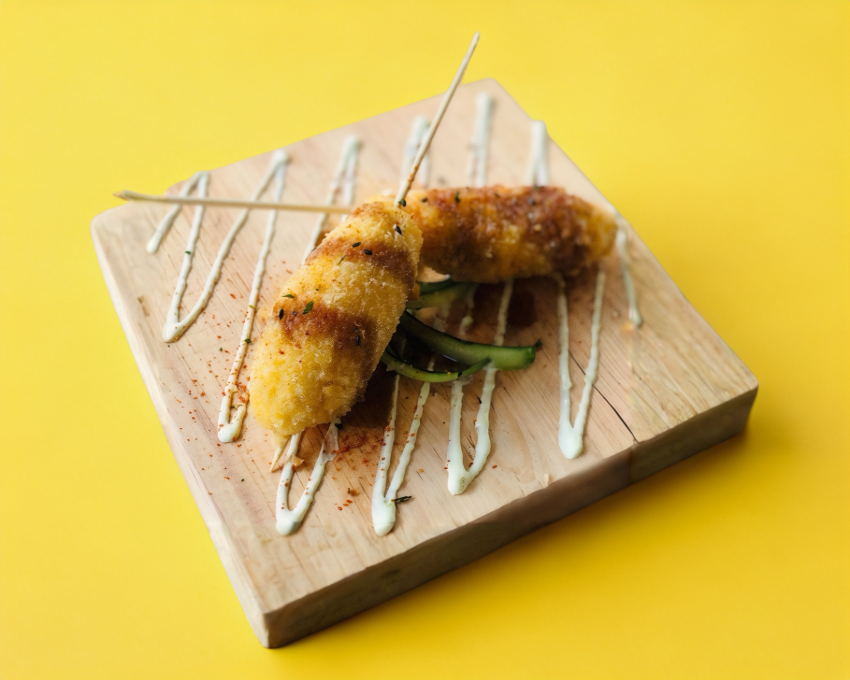 Brocheta de queso crema empanizado aderezado con salsa teriyaki y togarashi (1 pz)