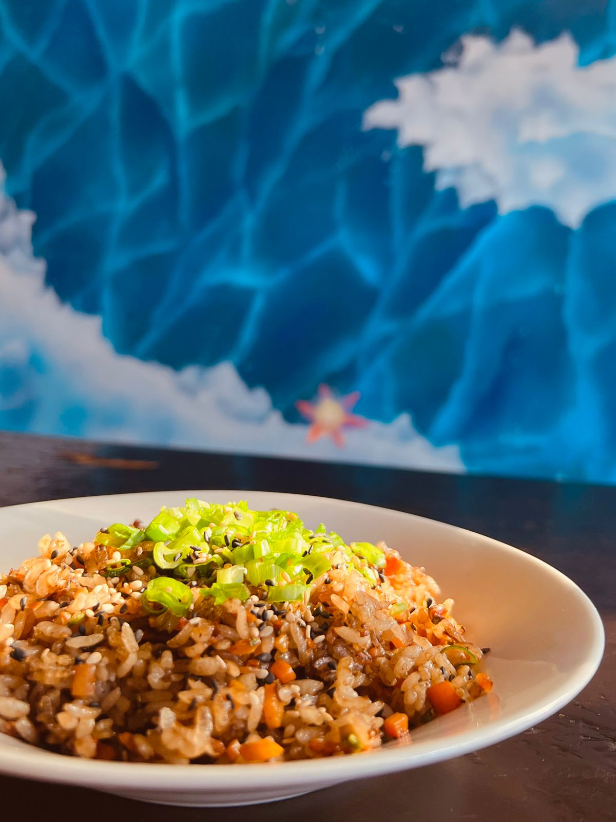 Delicioso arroz frito con calabaza y zanahoria, bolitas de queso crema empanizadas, aguacate, tampico, camaron, pollo, arrachera, negi picado y ajonjoli