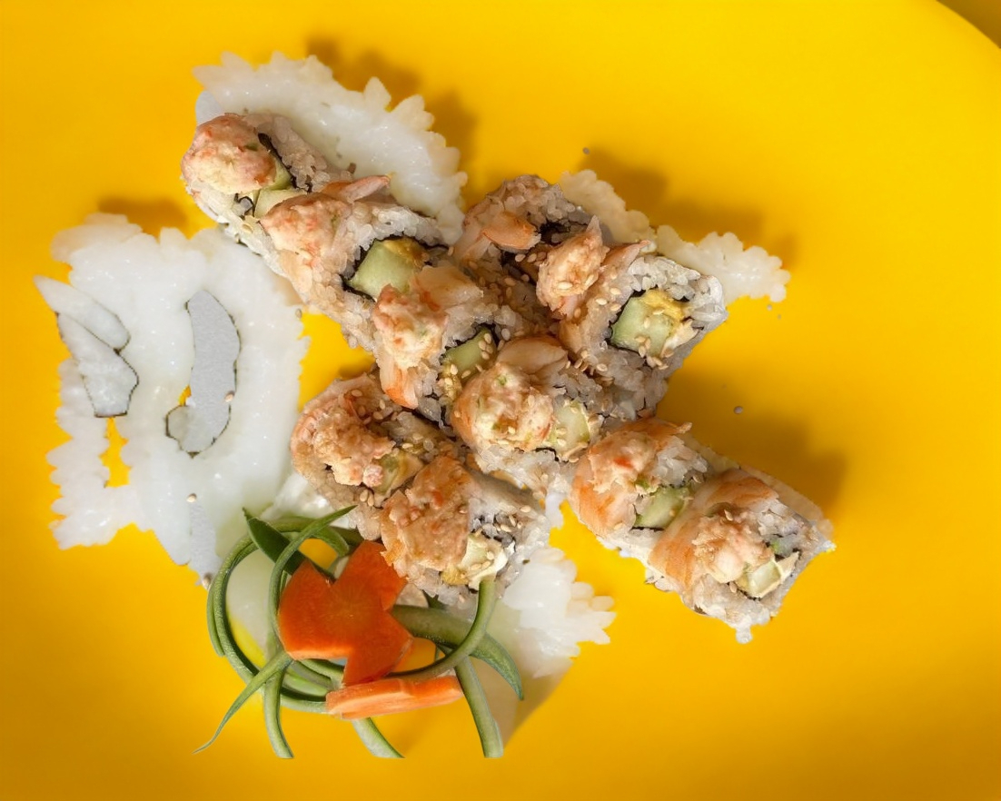 Rollo envuelto en mango, relleno de queso crema, pepino, aguacate y camarón empanizado, salsa chipotle y queso fundido le fuera