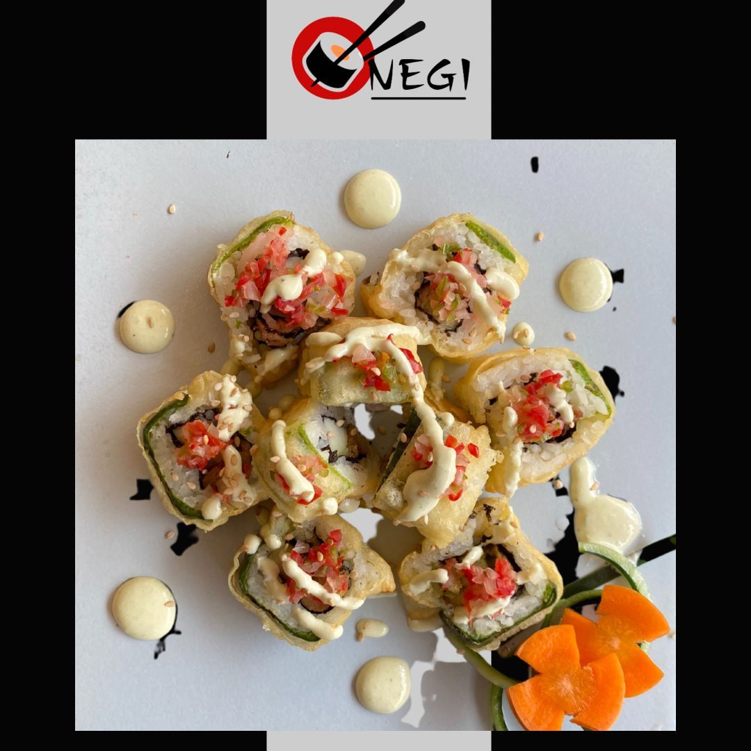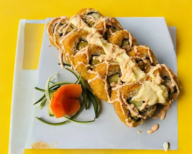 Rollo envuelto de verduras tempura, relleno de pepino, aguacate, queso crema, camarón y surimi, con salsa chipotle y togarashi.