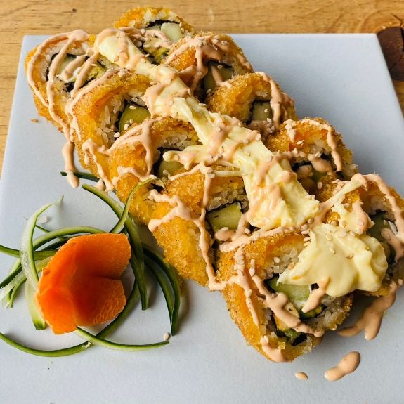 Bola de arroz rellena de camaron, surimi, pollo, arrachera, pepino, queso crema, queso gouda, aguacate, empanizada y aderezada con salsa de anguila, chipolte y tampico