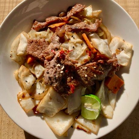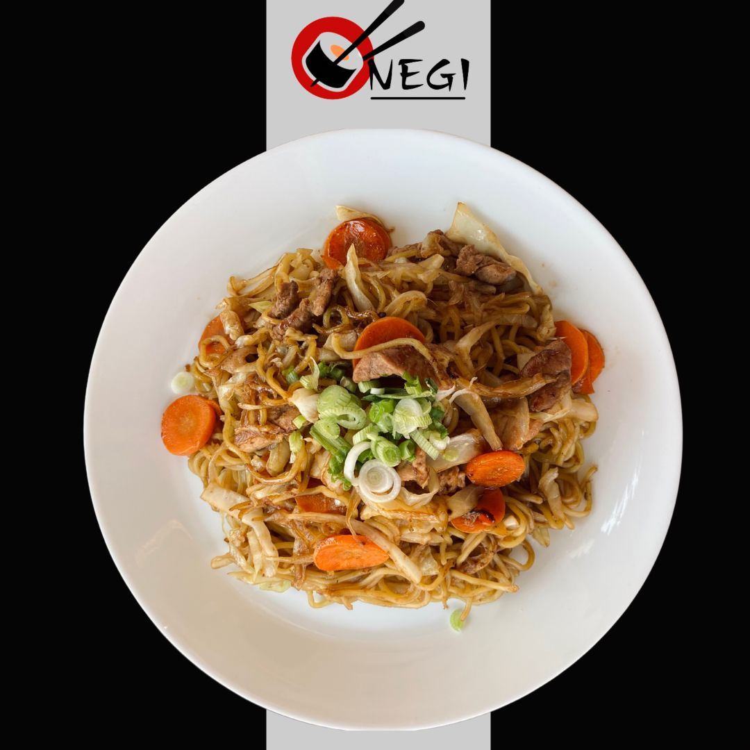 Deliciosos fideos udon salteados con ajo frito, calabaza, zanahoria y col picadas, aderezada con aceite de ajonjoli y salsa de soya, acompañadas con limon y negi picado