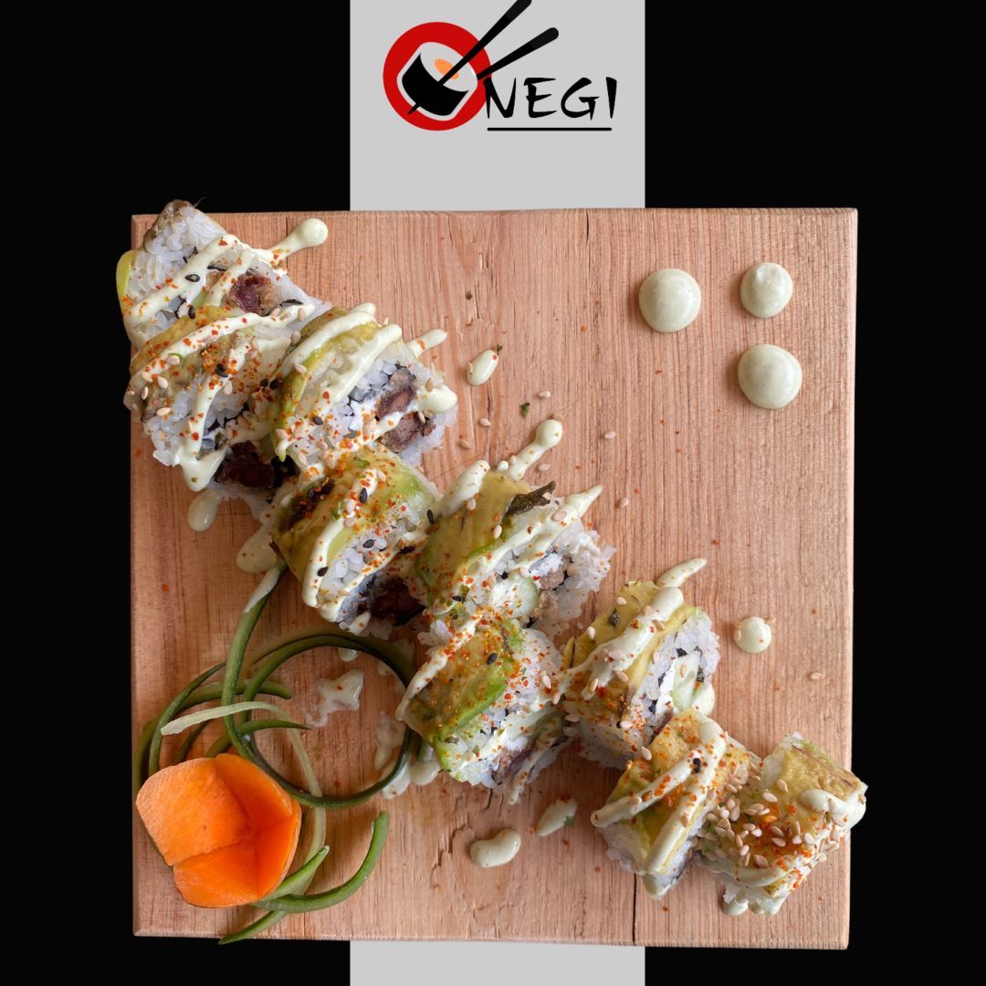 Rollo envuelto en ajonjoli, relleno de queso crema, pepino y aguacate, por fuera pollo crujiente en salsa de naranja, cebolla frita, salsa chipotle y negi picado