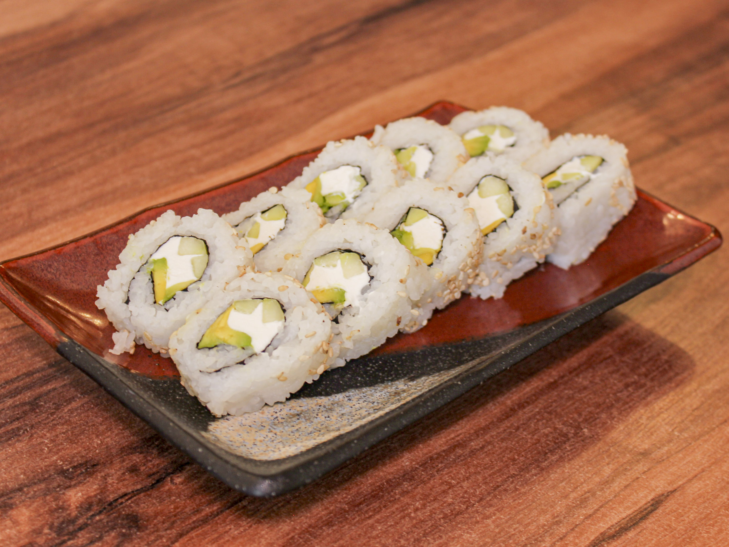 Rollo envuelto de verduras tempura, relleno de pepino, aguacate, queso crema, camarón y surimi, con salsa chipotle y togarashi.